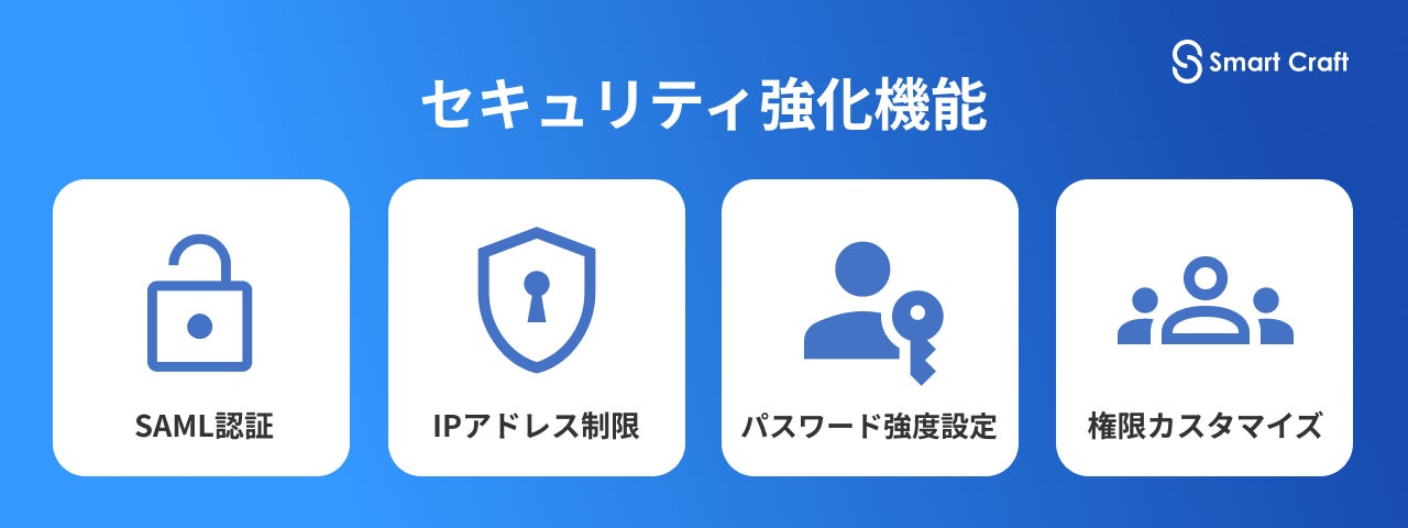 株式会社Smart Craft(本社:東京都渋谷区、代表取締役 浮部史也、以下「当社」)は、製造現場DXプラットフォーム「Smart Craft」の機能として、既存のセキュリティ機能に加え、更なるセキュリティ強化を目的とした機能をリリースしたことをお知らせします。今回のアップデートにより、導入企業はより高度なセキュリティポリシーの運用とアクセス管理が可能となり、安全かつ柔軟なシステム利用を実現いたします。