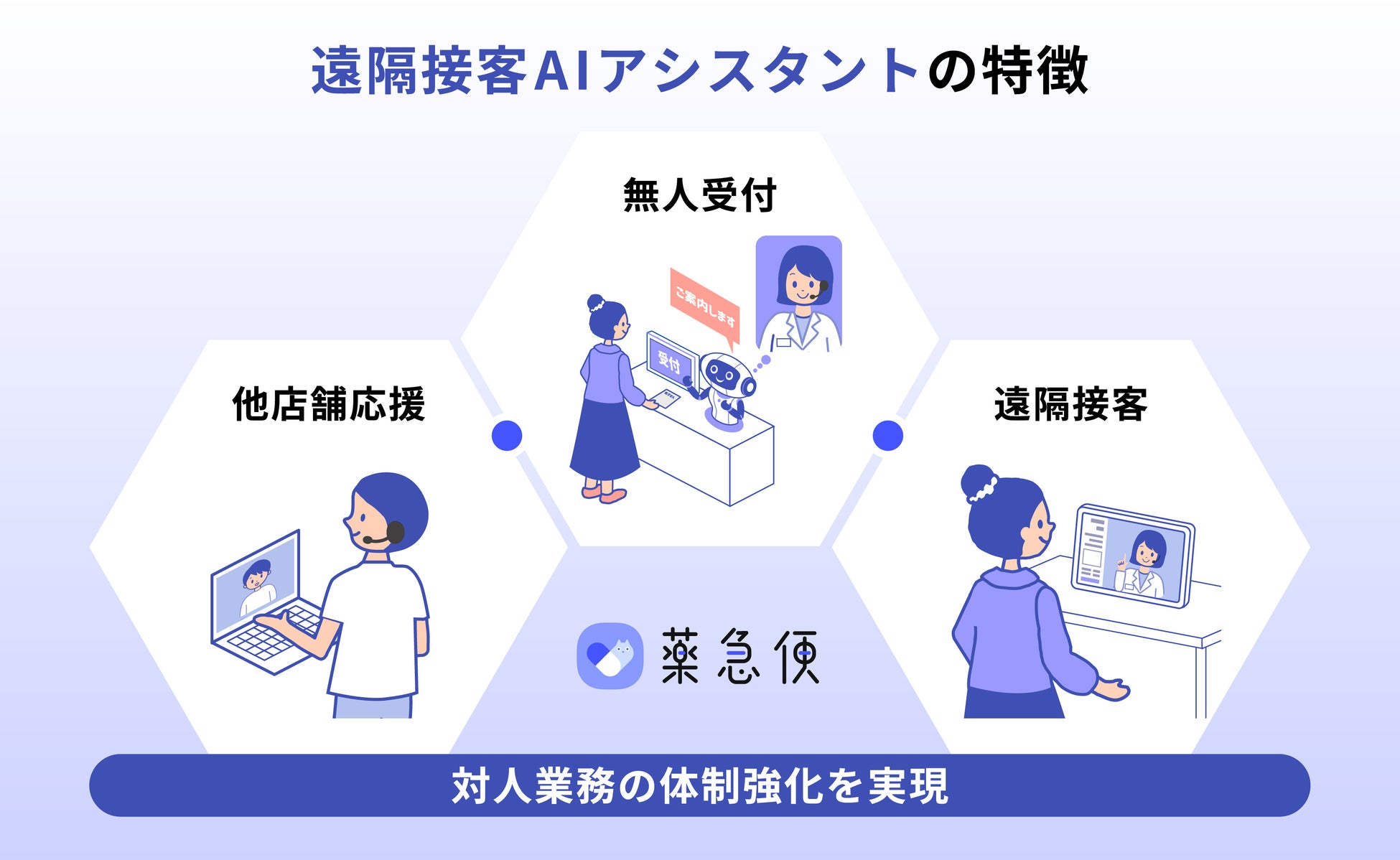 このような背景から、最適な人員配置により薬剤師の業務負荷を軽減し、患者対応の品質向上を実現する「遠隔接客AIアシスタント」を開発し、このたび提供を開始いたします。