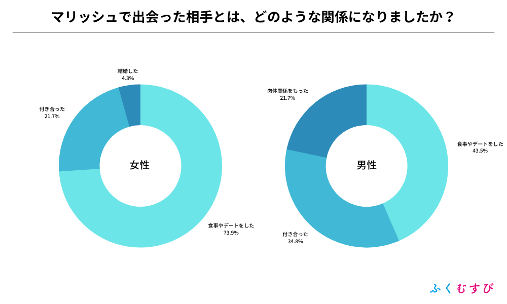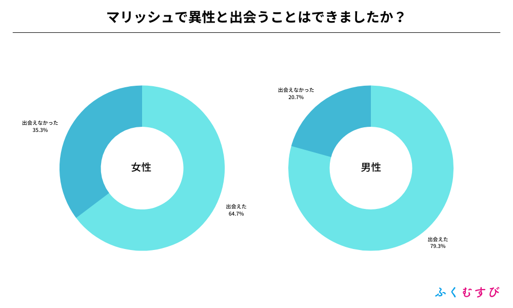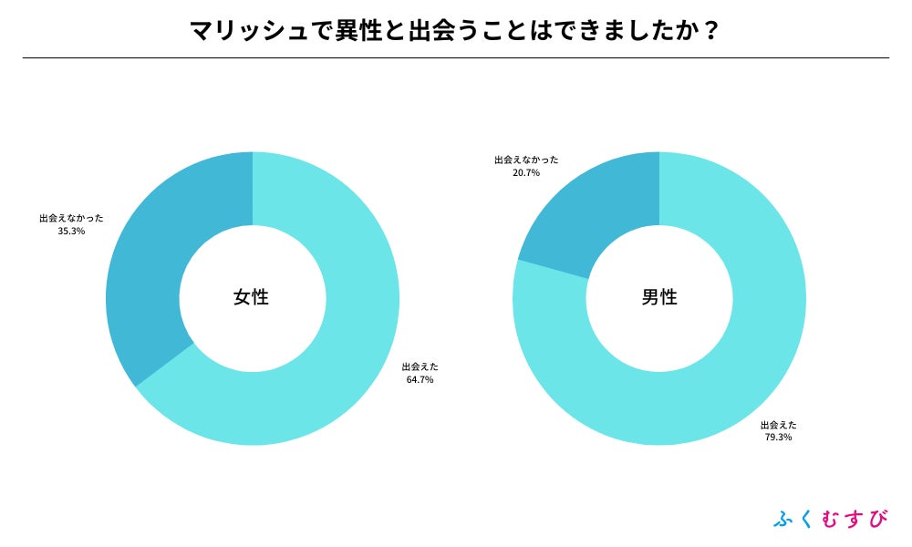 ・マリッシュで異性と出会えた割合は、男性が79.3%、女性が64.7%となりました。