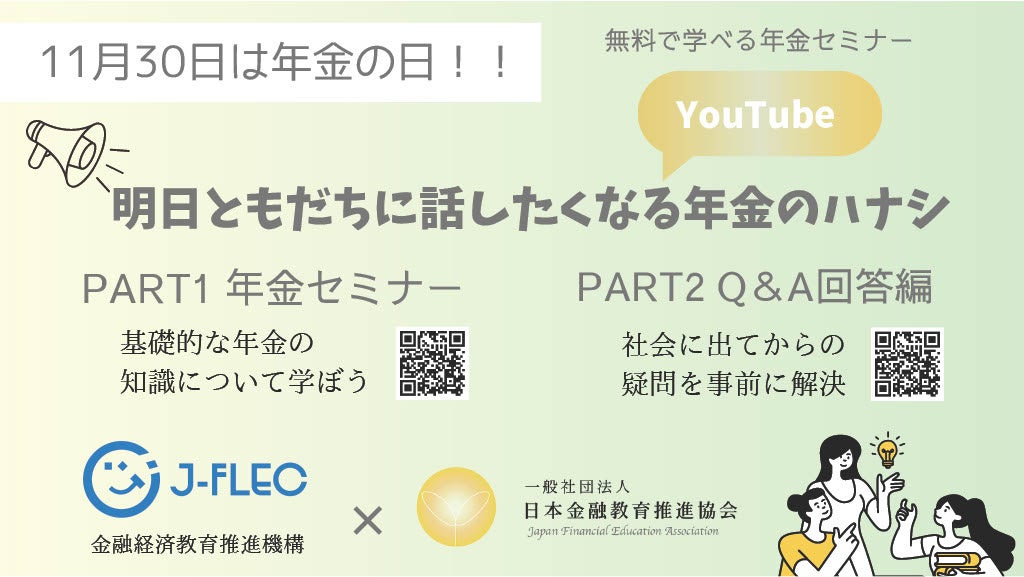 一般社団法人 日本金融教育推進協会(代表理事:横川楓)は、年金の日の金融教育セミナーを配信します。このセミナーでは、将来の被保険者・受給権者である学生/若年層を対象に、年金の知識を楽しく学べる機会を提供します。