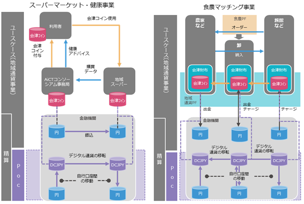 会津若松市内で利用開始されている地域通貨「会津コイン」を購買インセンティブとして、スーパーマーケットでの購買データにより健康アドバイスを行う事業において、会津コインの付与主体とスーパーマーケット事業者間での精算を、デジタル通貨「DCJPY」の移転により行います。