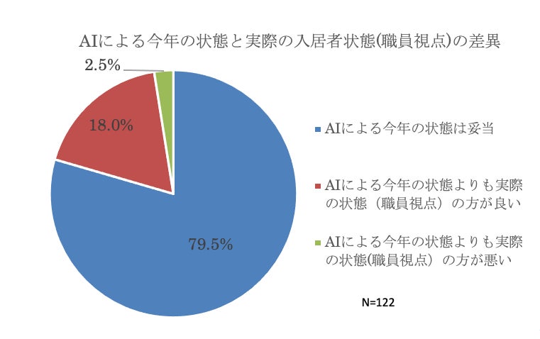 今回は、「SOIN-R」による状態の判断を職員の視点による実際の状態と比べてみたところ、職員は79.5%を妥当と、18.0%が「SOIN-R」の判断よりも実際の状態の方が良い(本人が自分の状態を過小評価している)と評価しており、「SOIN-R」の状態判断の有効性を検証することができました。