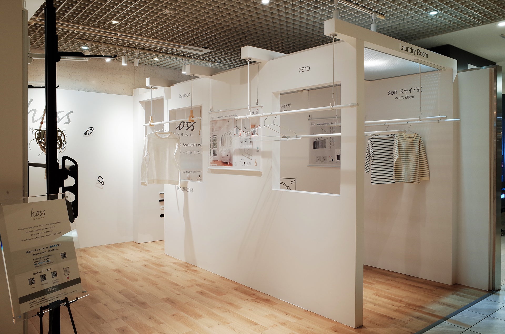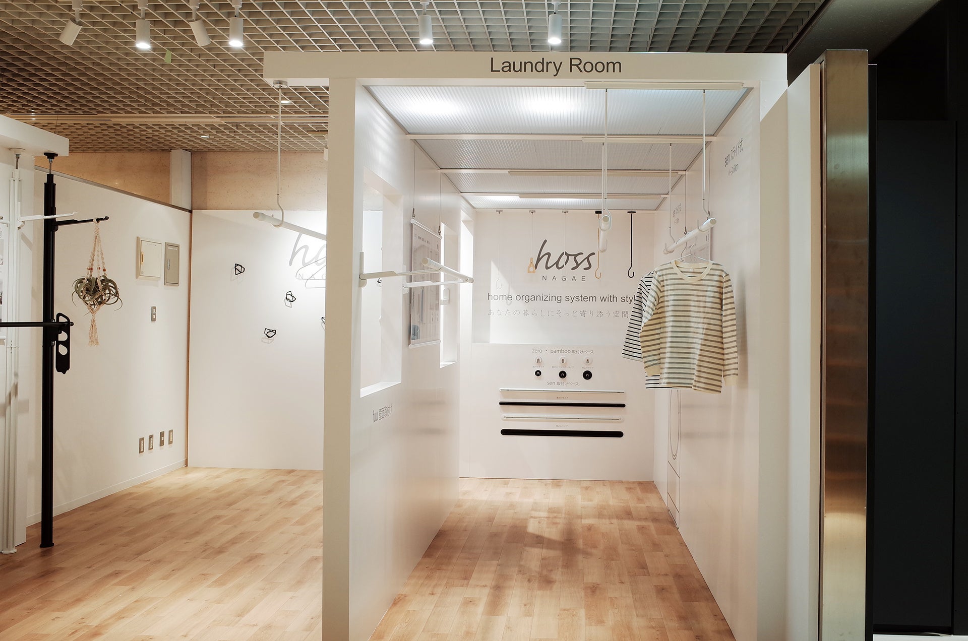 「hoss NAGAE Space TOKYO」「hoss NAGAE Space OSAKA」では、シンプルモダンなデザインと機能性を備えた物干し金物・天井突っ張りフレーム・壁面フックを中心に、“暮らしをととのえる”プロダクトを展示しています。ランドリールームを想定したシーンで、動作や操作感を実際に体験していただける構成です。