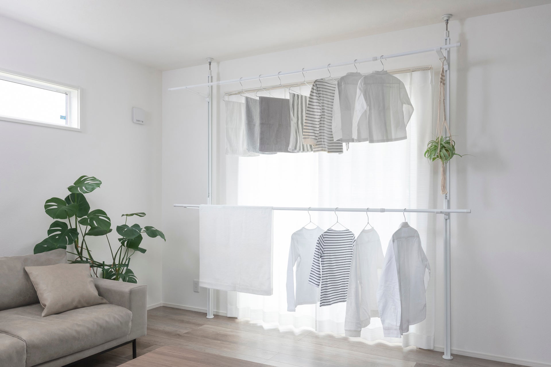 2本の物干し竿でたっぷりと洗濯物を干すことができ、使用しないときはフックを片側に寄せることで空間を有効活用できます。フックはベースから取り外すことも可能で、よりすっきりとした印象に。また、スライド機構により、物干し竿の間隔を自在に調整できるため、洗濯物のサイズや量に合わせたアレンジが可能。限られた空間でも効率よく干せる設計です。
