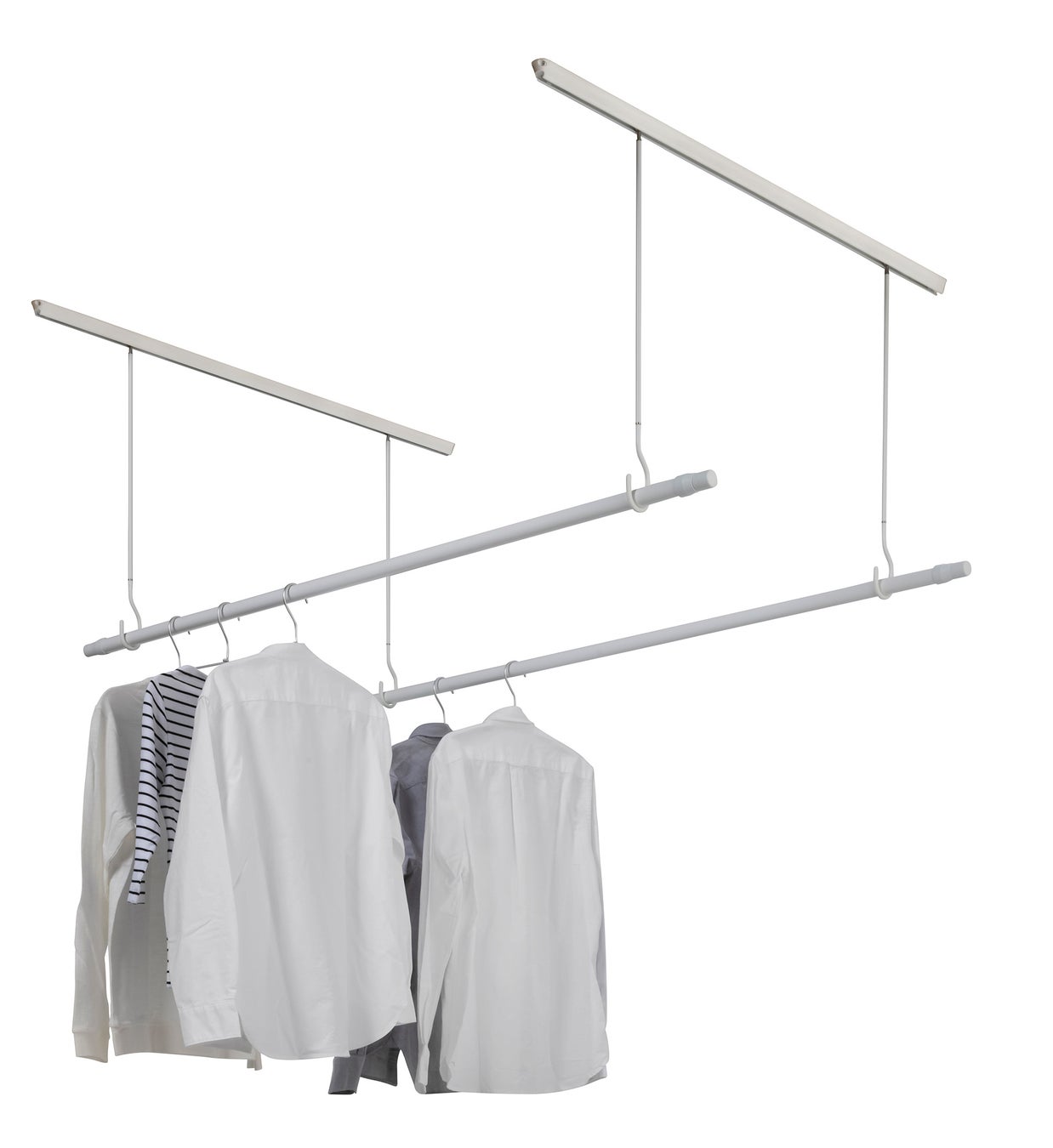 天井に取り付けた2本の平行ベースに、物干し竿を掛ける、ベースに沿ってスライド可能なフックを2対セットした室内物干し金物です。