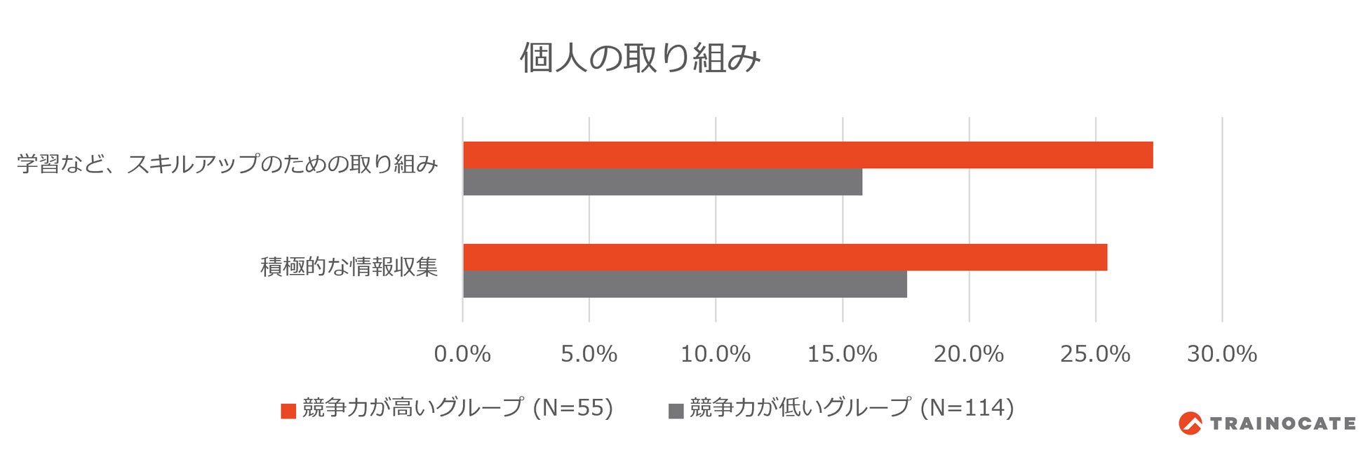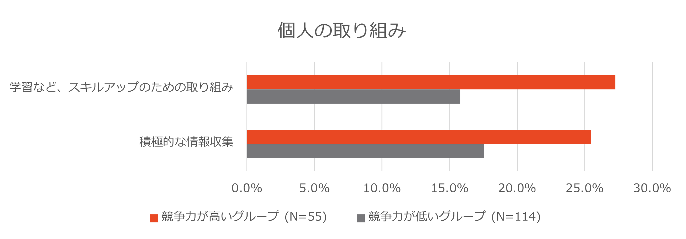 競争力が高い個人は、スキルアップのための取り組みを、企業はそのための支援を実施している傾向競争力が高い個人・企業が、「デジタル・技術スキル」を向上させるために取り組んでいることを、そうでない個人・企業と比較したところ、個人では「学習など、スキルアップのための取り組み」「積極的な情報収集」をしており、企業としては「社員のスキルアップのための施策、学習環境の整備」や「IT部門の拡大、新設」「積極的なITへの投資」などに取り組んでいることが分かりました。