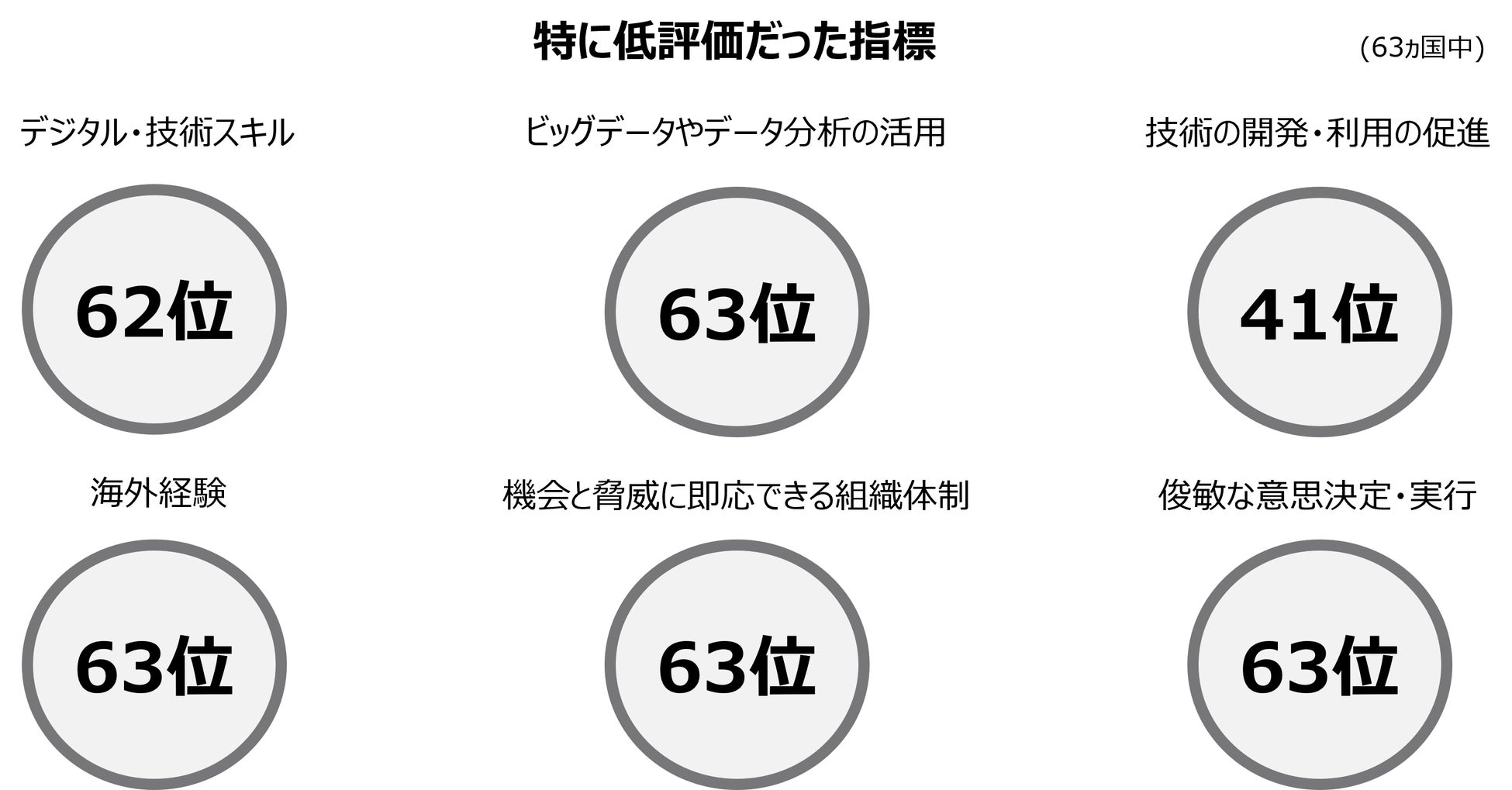 日本は63ヵ国中29位と世界的な評価は過去最低の水準。デジタル面で技術後進国になりつつあるが自国への評価は高く、認識のズレが明らかに