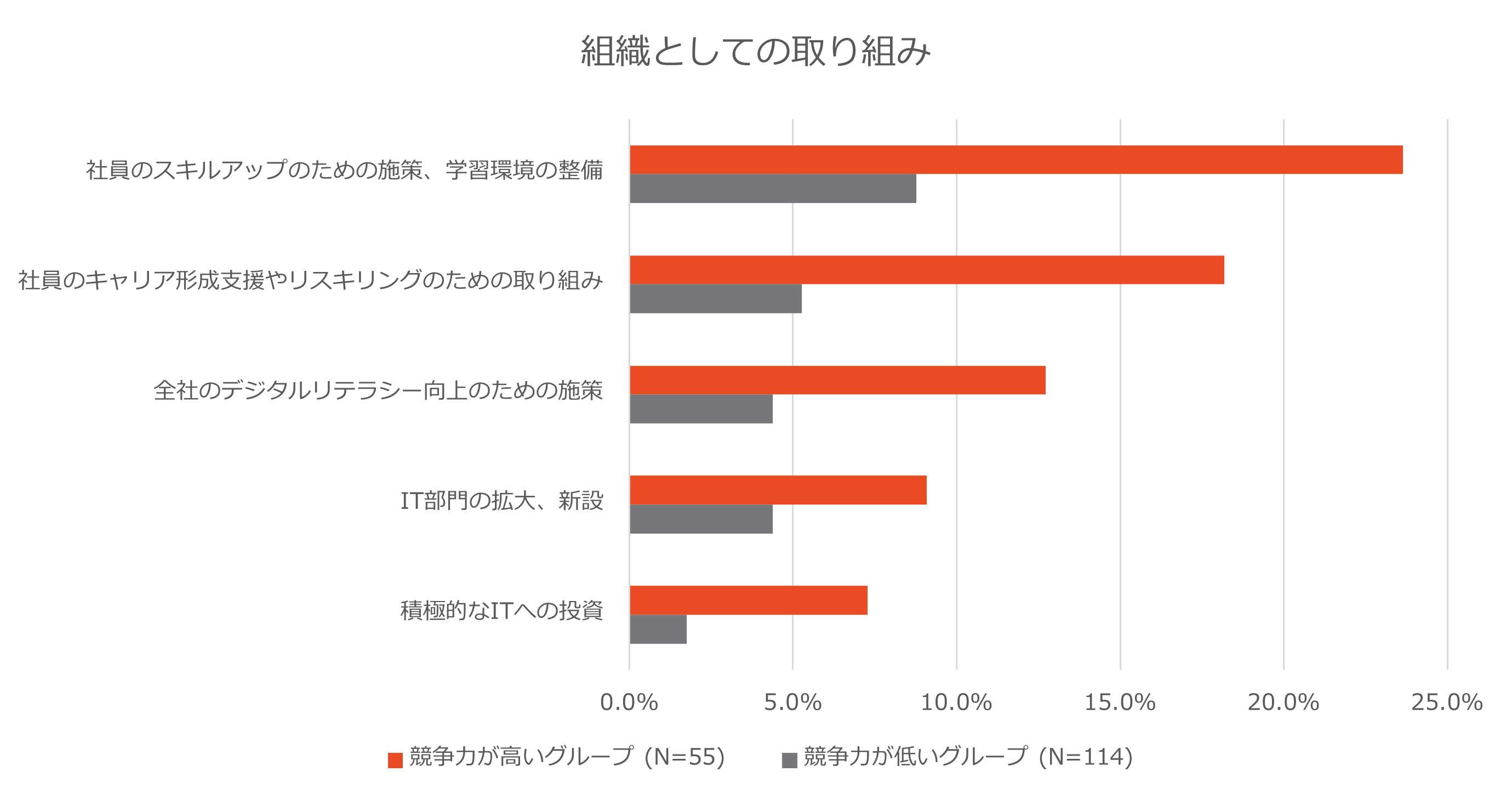 「デジタル・技術スキル」への対応が進んでいる個人・企業を競争力が高いグループと見なし、「デジタル・技術スキル」を向上させるために取り組んでいることを、そうでない個人・企業と比較したところ、個人では「学習など、スキルアップのための取り組み」「積極的な情報収集」をしており、企業としては「社員のスキルアップのための施策、学習環境の整備」や「IT部門の拡大、新設」「積極的なITへの投資」などに取り組んでいることが分かりました。