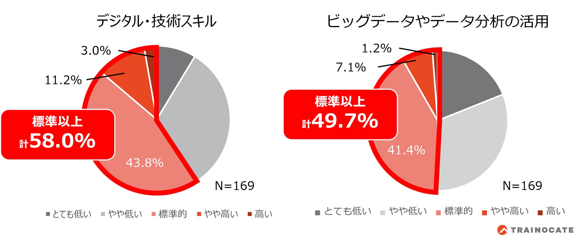 調査指標の中でも特に日本の評価が低かった①「デジタル・技術スキル」②「ビッグデータやデータ分析の活用」に関して、日本は世界と比べてどの程度のレベルかという質問に対し「標準以上」と答えた人がそれぞれ①58.0%/②49.7%に登り、実態と国内の認識にズレが生じています。なお、同じ項目について自身または自社がそれに対応できていると答えた人はそれぞれ①32.6%/②17.8%に留まりました。