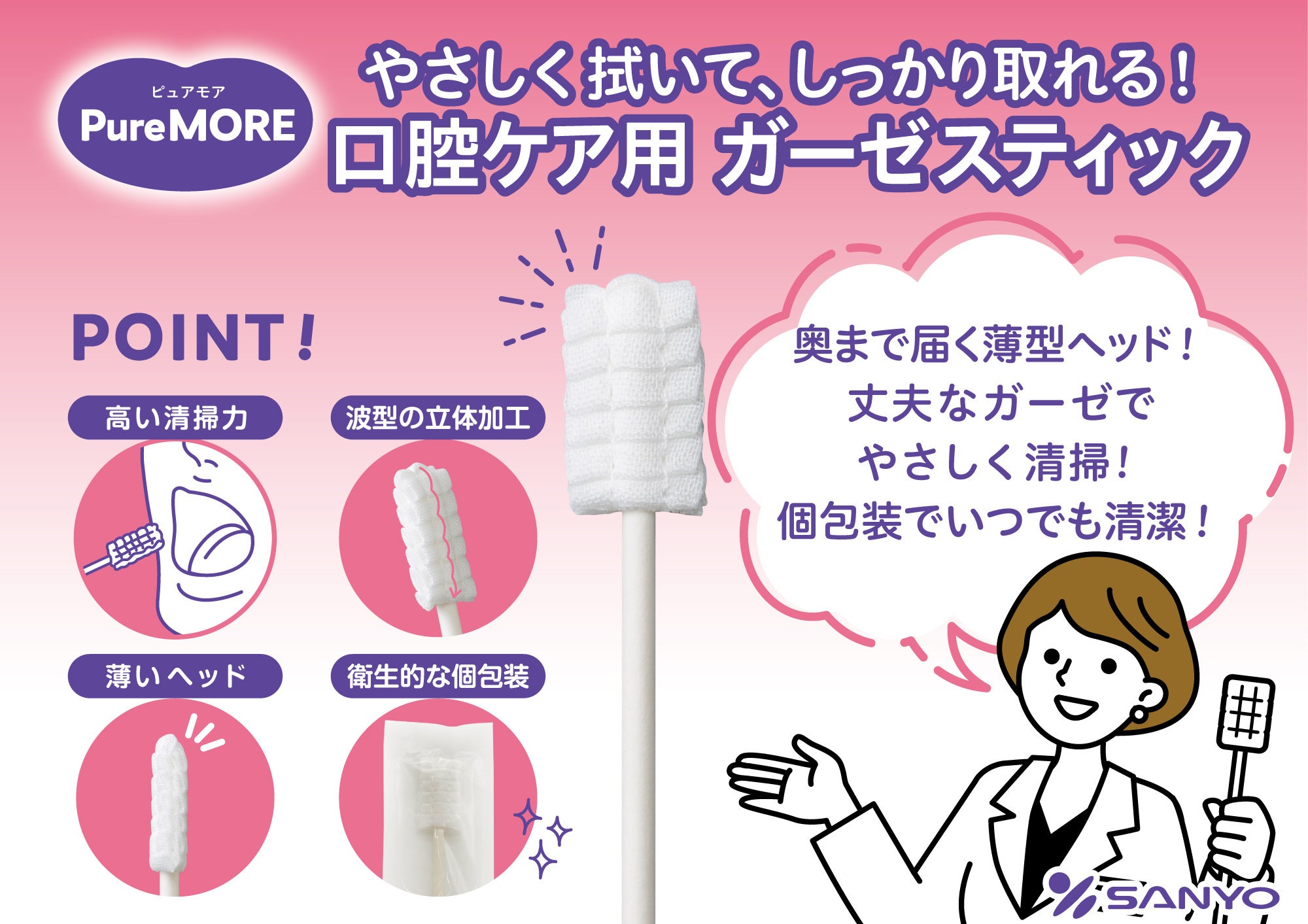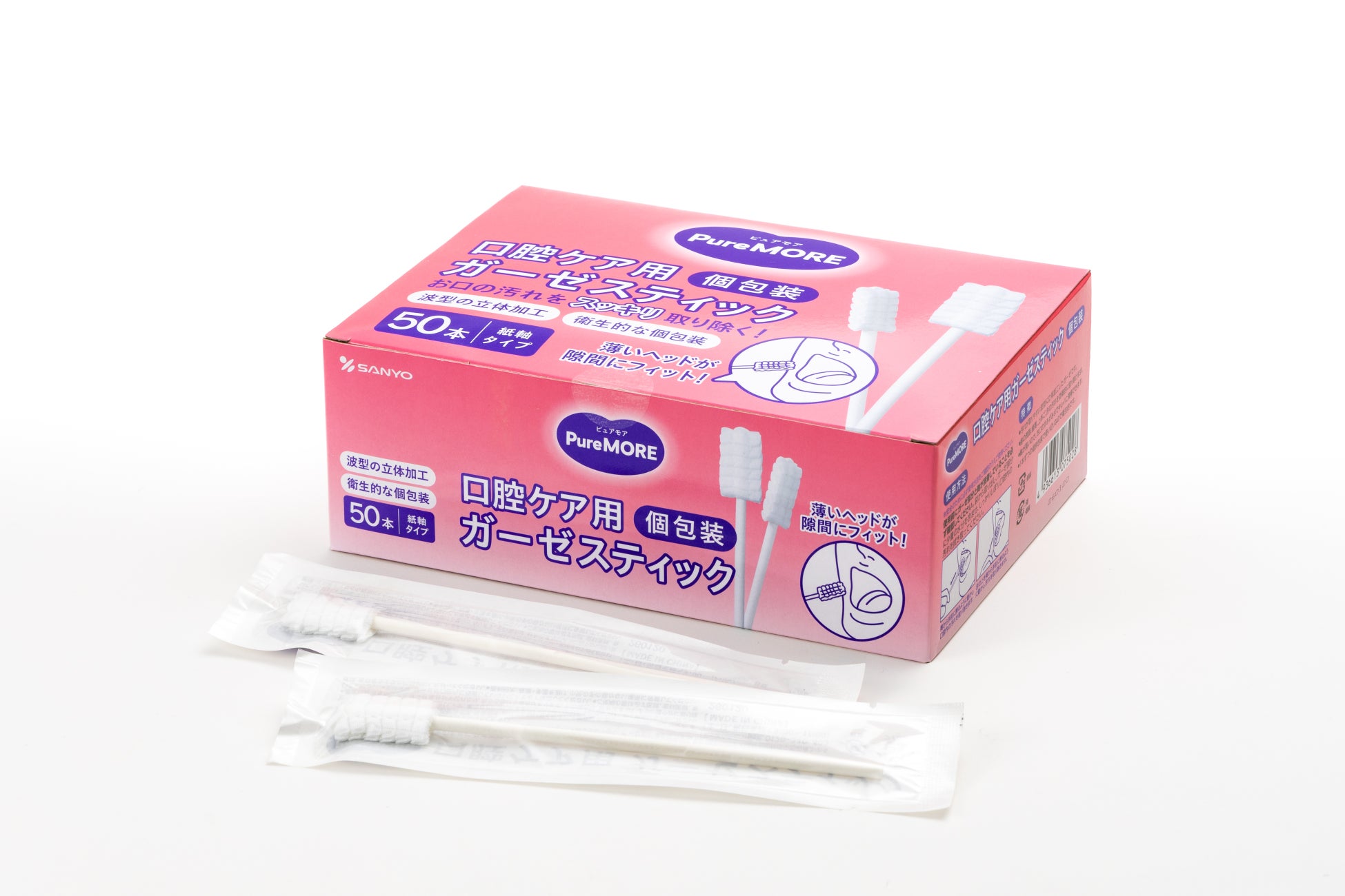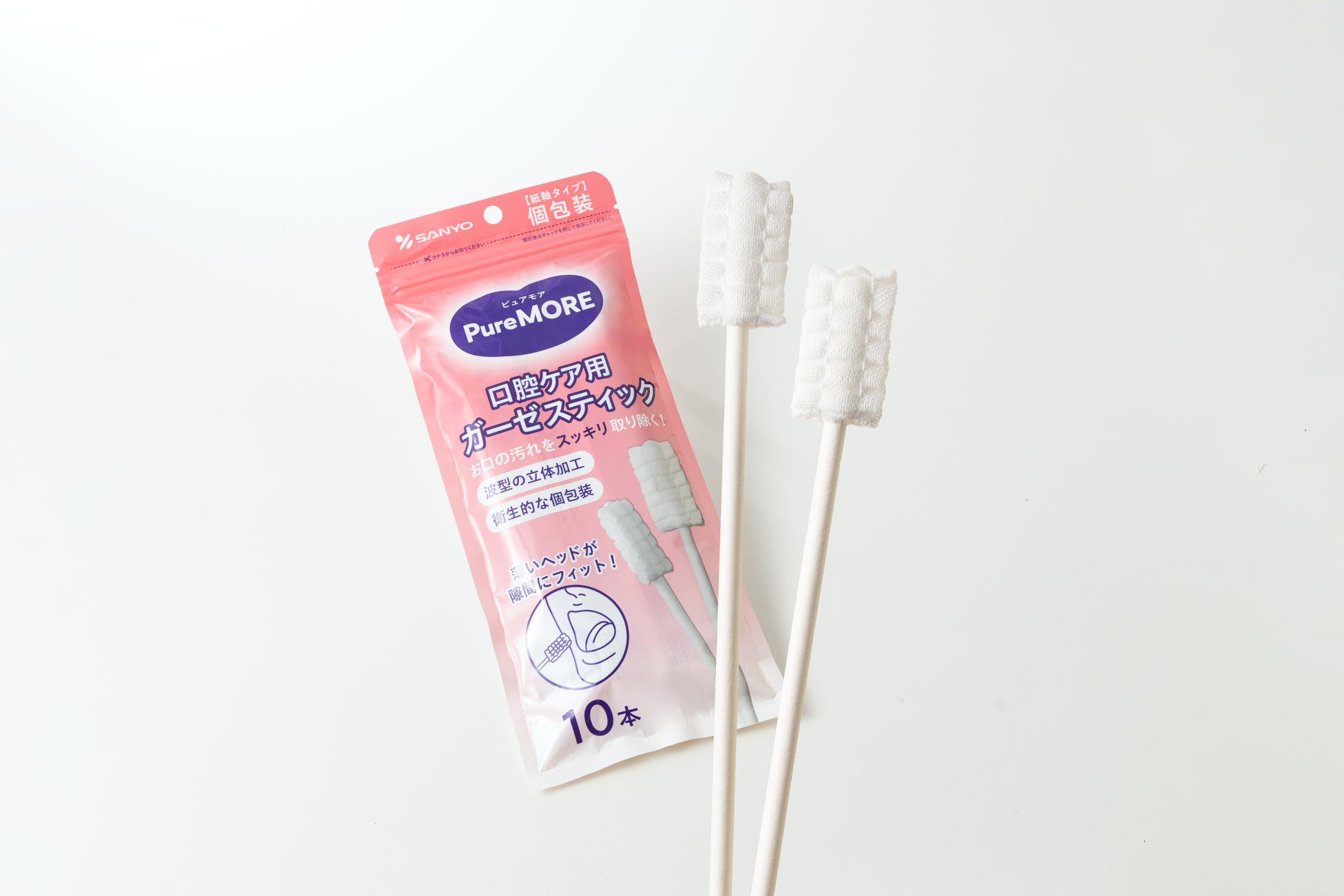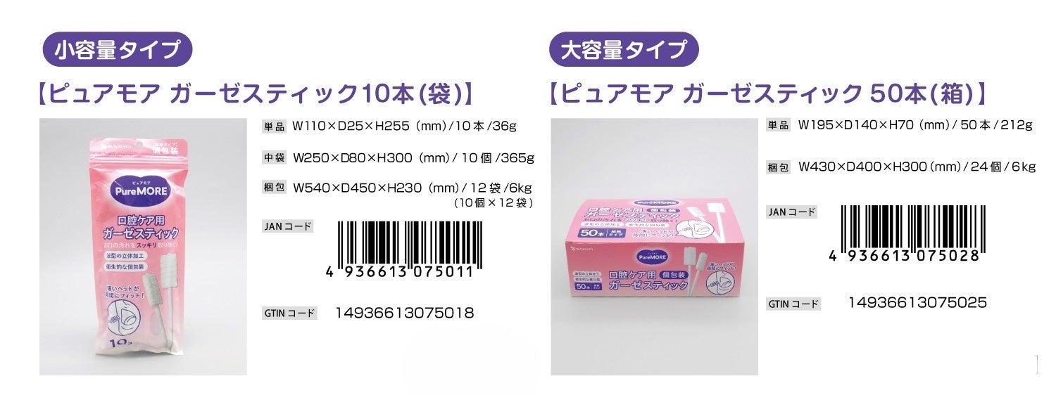 綿棒一筋、創業59年目の綿棒メーカー株式会社山洋(本社:大阪府富田林市、代表取締役社長:日比 努)は、急激な高齢化社会に伴う口腔ケア需要の増大を受け、介護・衛生現場の負担を軽減するため、ガーゼ素材のメリットを最大限活かした介護補助用綿棒の新しいアイテムとして新商品ブランド「ピュアモア 口腔ケア ガーゼスティック」シリーズ2種(袋入り10本/箱入り50本)を発売致しました。