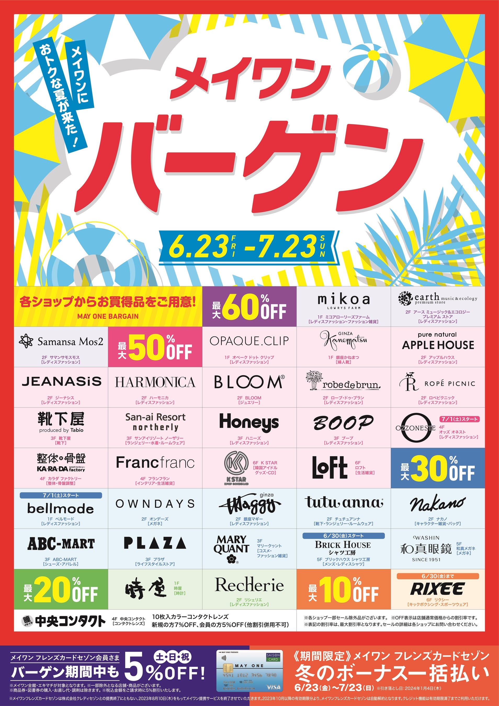浜松駅ビルメイワンでは、6月23日(金)からメイワンバーゲンを開催します。
