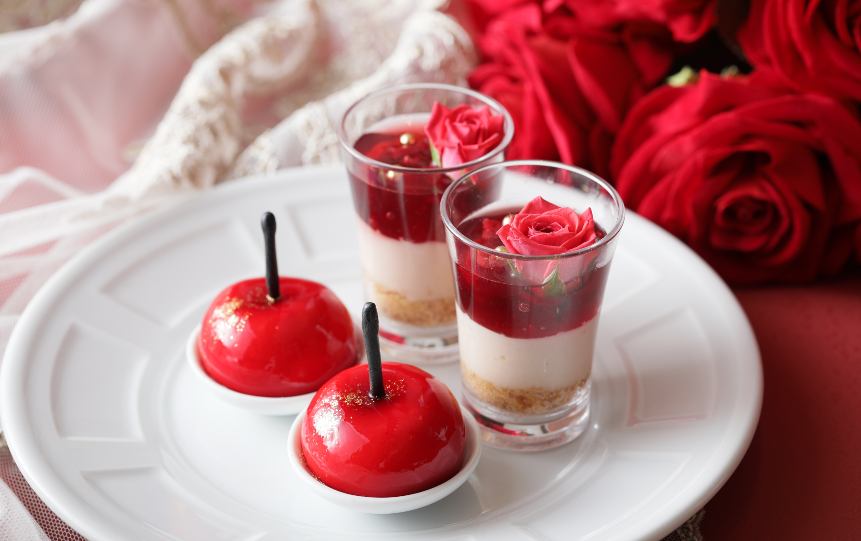 つやめく美徳~チェリームース~:「つやめく美徳」のシグネチャーである真紅に染まった「チェリー」を表現。チェリーの優しい甘さと甘酸 っぱさが楽しめる二層のムースに、つやめく真紅のグラサージュを施し、上品に仕上げました。
