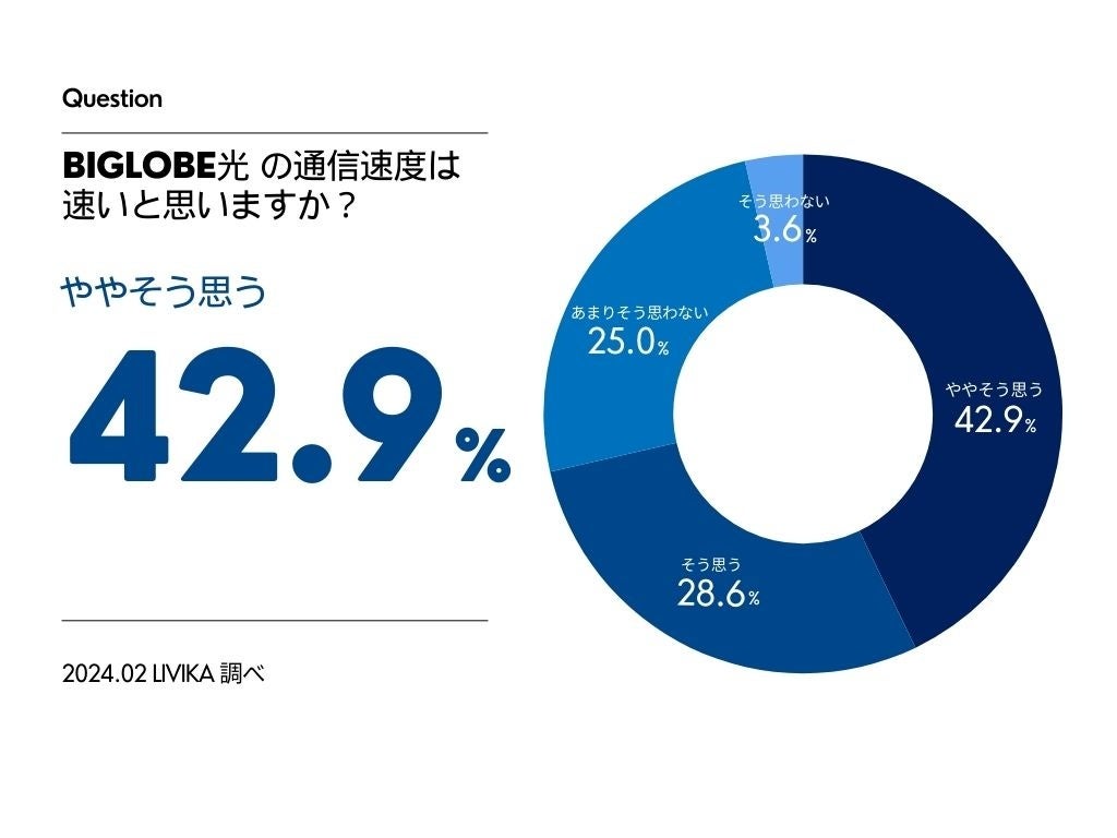 BIGLOBE光の通信速度についての調査したところ、BIGLOBE光の利用者の中で通信速度が早いと回答された方が、「ややそう思う」42.9%、「そう思う」28.6%という結果になりました。