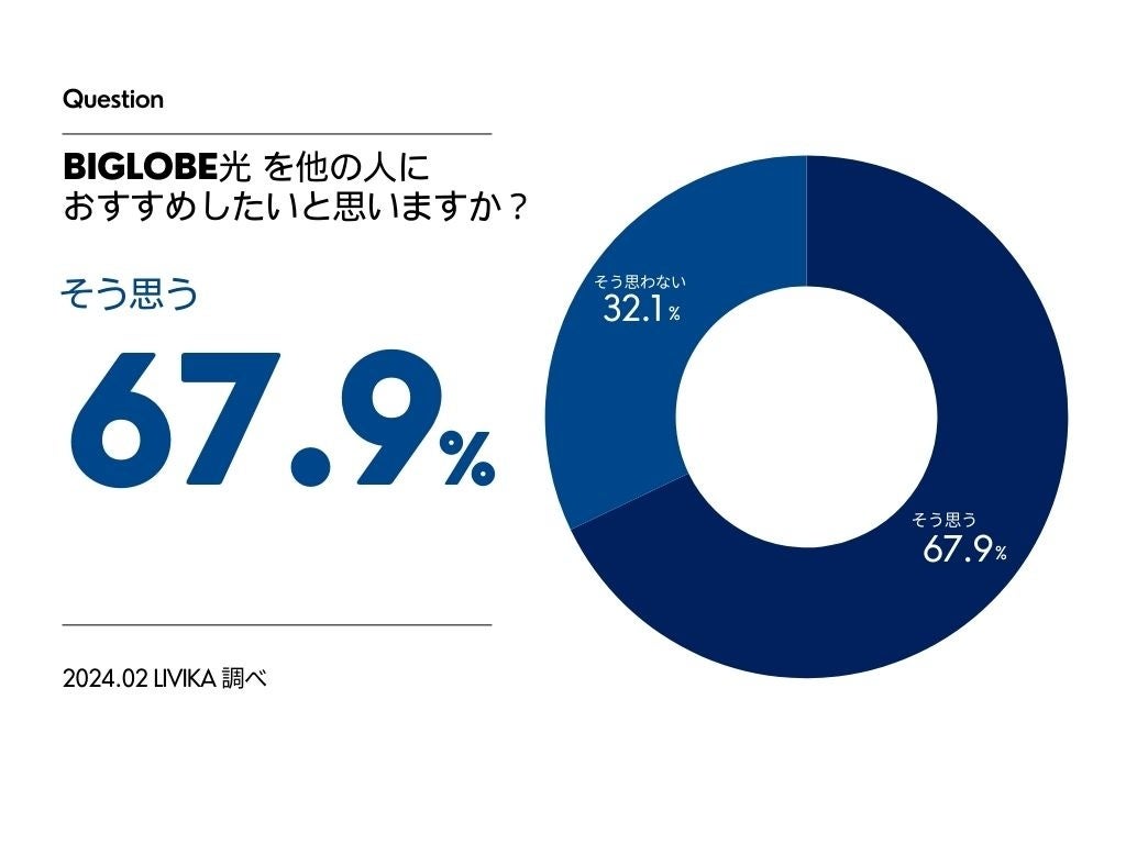 BIGLOBE光をご利用いただいている方の67.9%が、この回線を他の方にお勧めできると回答されています。