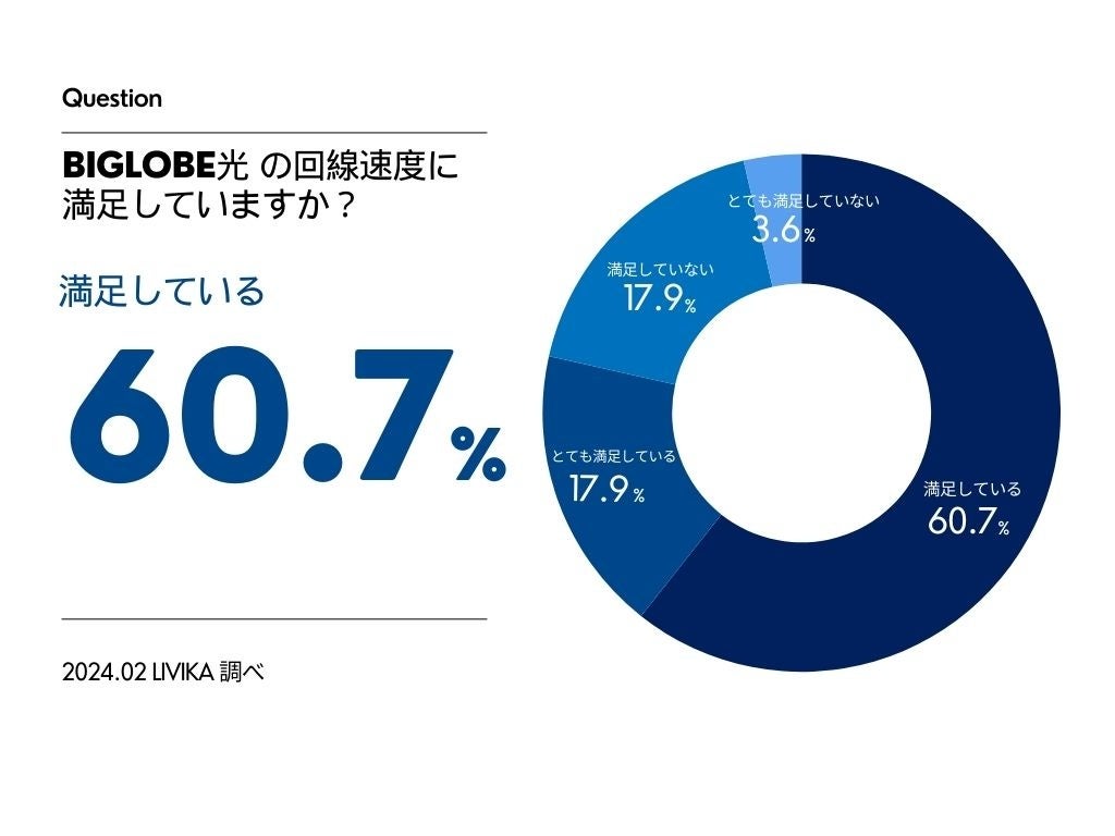 BIGLOBEの回線速度に関する満足度について調査したところ、回答者の60.7%が「満足している」と回答されました。また、17.9%の方が「とても満足している」とのことです。
