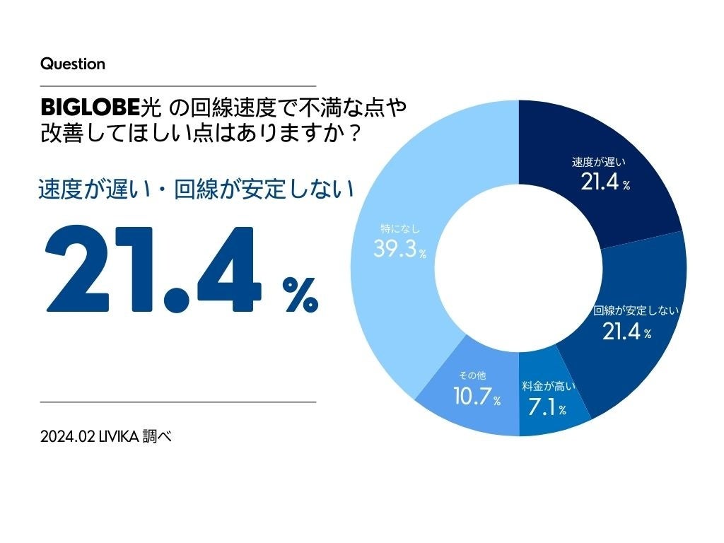 速度に満足しているという回答がある一方で、BIGLOBEの回線速度に関する不満の中で最も多かったのは、「速度の遅さ」(21.4%)および「回線の不安定さ」(21.4%) となりました。