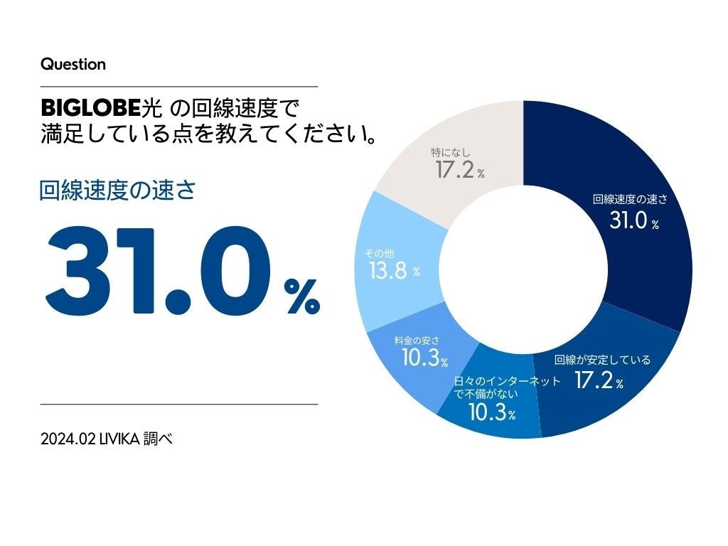 BIGLOBE光の回線速度に関して満足している点として、「速度の速さ」31%「回線の安定性」17.2%などがあげられました。