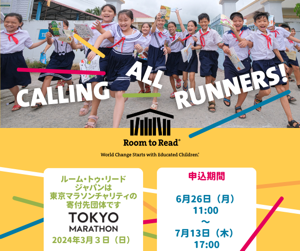 ルーム・トゥ・リードは昨年に引き続き、2024年3月3日(日)開催予定の「東京マラソン2024チャリティ」の寄付先団体に選ばれました。この度、ルーム・トゥ・リードは「東京マラソン2024」において世界中から140名のチャリティランナー*を募集し、5,000名の子ども達への識字教育および女子教育プログラム提供を目指します。多くのランナーを魅了してやまない世界屈指の大会「東京マラソン」に出場し、子ども達に教育という一生のギフトを贈ってくださるランナーを募集しています。また、ご寄付だけの応援も大歓迎です。ご応募をお待ちしております。