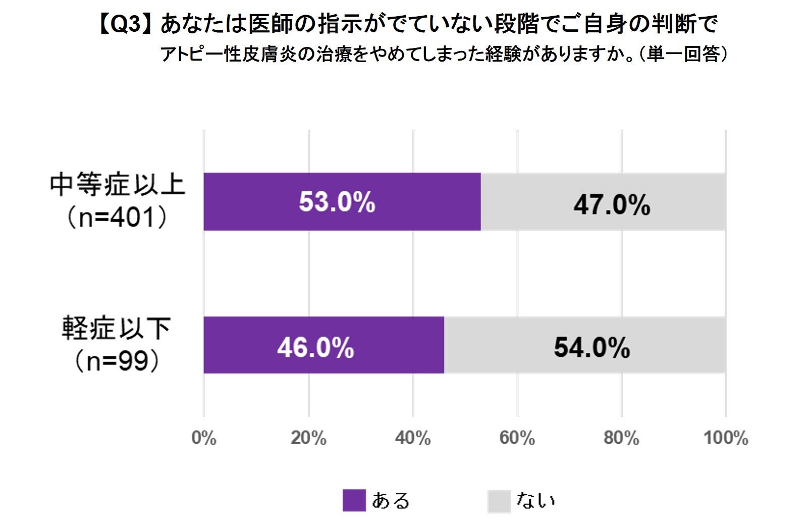 3. 中等症以上の患者さんの半数以上が医師の指示がでていない段階で自身の判断で治療をやめてしまった経験がある