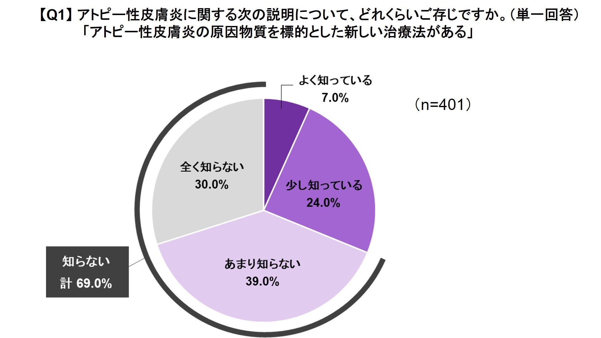 今回の調査で、中等症以上のアトピー性皮膚炎患者さんでも「アトピー性皮膚炎の原因物質を標的とした新しい治療法がある」ことを知らない方が69.0%(Q1参照)という結果でした。