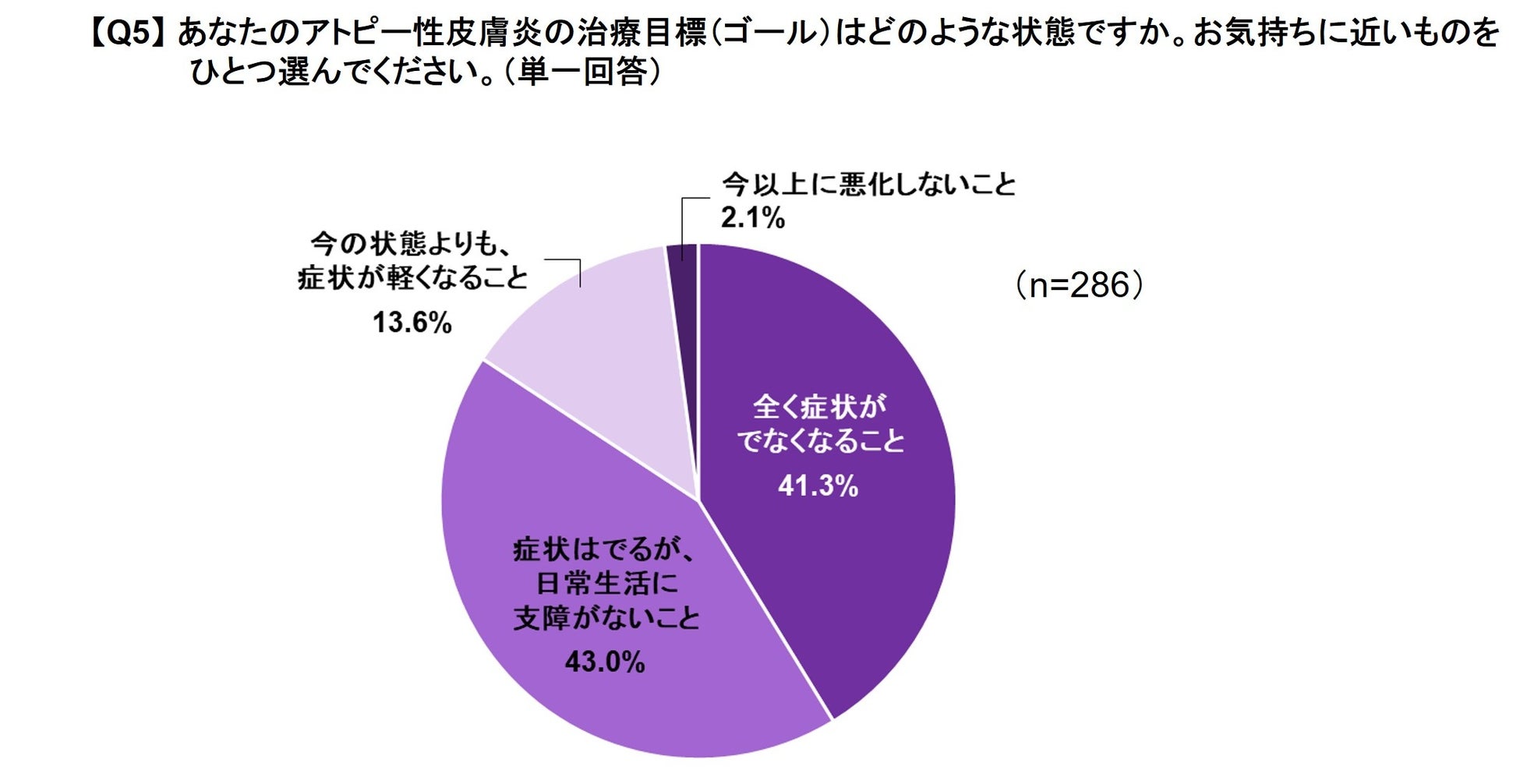 治療目標(ゴール)をもっていると回答した方に「アトピー性皮膚炎の治療目標(ゴール)はどのような状態ですか」とお聞きしたところ、「症状はでるが、日常生活に支障がないこと」が43.0%で、「全く症状がでなくなること」は41.3%でした。「全く症状がでなくなること」よりも「症状はでても、日常生活に支障がないこと」を治療目標と考えている方が上回る結果となり、治療でよい状態を目指せることへの諦めがみえる結果となりました。