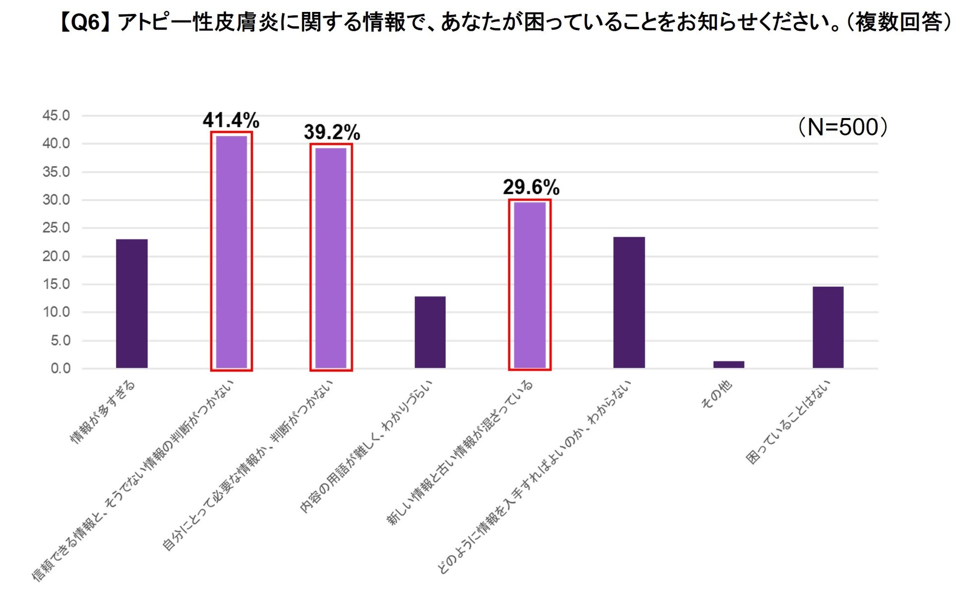 6. アトピー性皮膚炎の情報で困っていることで多い回答は、「信頼できる情報とそうでない情報の区別がつかない(41.4%)」、「自分にとって必要な情報か、判断がつかない(39.2%)」、「新しい情報と古い情報が混ざっている(29.6%)」