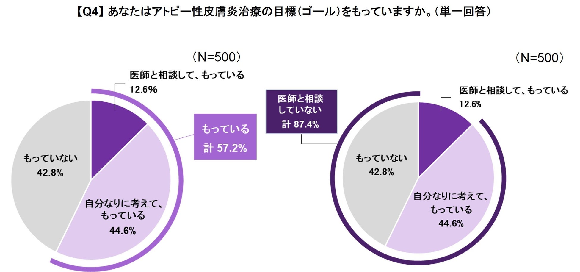 4. アトピー性皮膚炎治療の目標(ゴール)をもっている患者さんは57.2%。一方で約9割の患者さんが医師と治療目標を相談していない