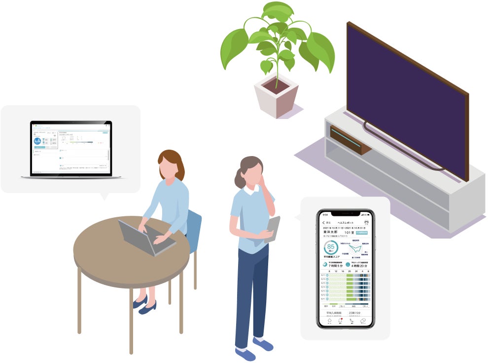 健康状態のモニタリング:脈拍・呼吸・体動・睡眠時間を24時間365日モニタリングし、自宅のお看取り、本人や家族の不安や介護負担の軽減も期待できる。