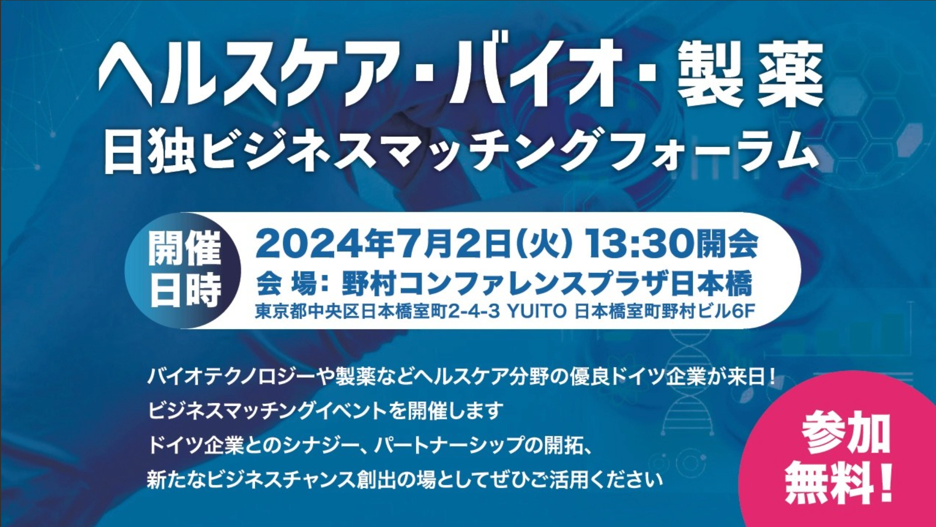 バイオテクノロジーや製薬などヘルスケア分野の優良ドイツ企業が来日!ビジネスマッチングイベントを開催します。ドイツ企業とのシナジー、パートナーシップの開拓、新たなビジネスチャンスの創出の場としてぜひご活用ください。