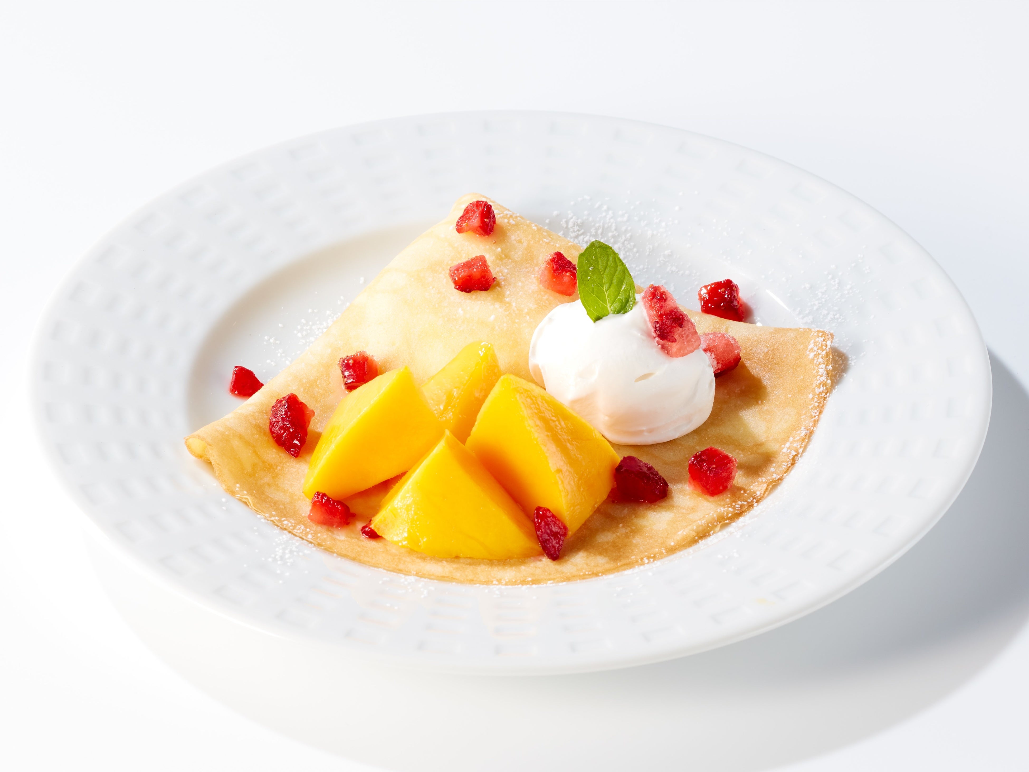 季節のフルーツ“アップルマンゴー”をたっぷり使用したデザートです。もちもちクレープにアップルマンゴーをのせ、ふわふわホイップを添えました。全体に散りばめたフローズンストロベリーがかわいらしく、見た目からも夏を感じられる一品です。