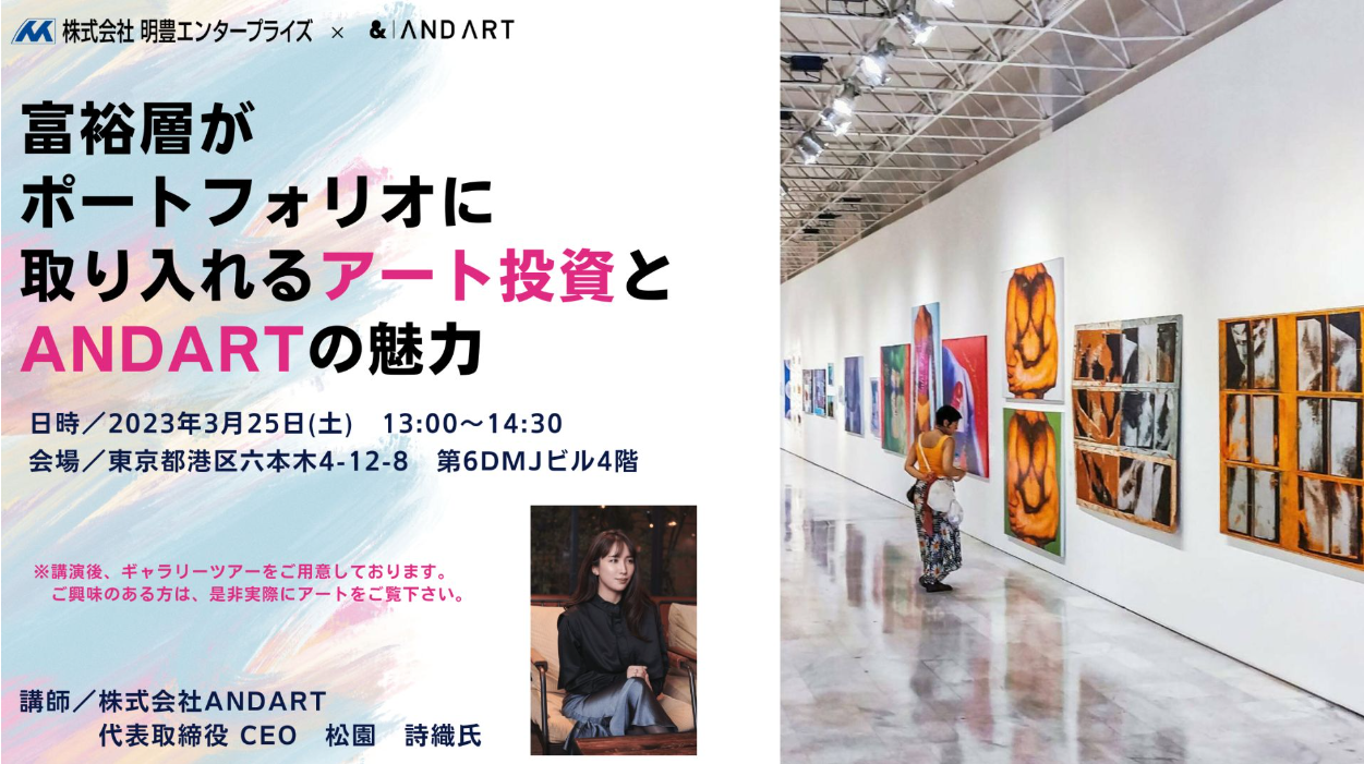 株式会社明豊エンタープライズ(東京都目黒区:代表取締役 矢吹 満、以下「明豊エンタープライズ」)は、アートコンサルティング事業やEC事業、共同保有プラットフォームサービス事業を行う株式会社ANDART(東京都港区:代表取締役 CEO 松園 詩織)とコラボレーションし、アートを実際に巡る「富裕層がポートフォリオに取り入れるアート投資とANDARTの魅力」セミナーを3月25日(土)両社で初開催いたします。