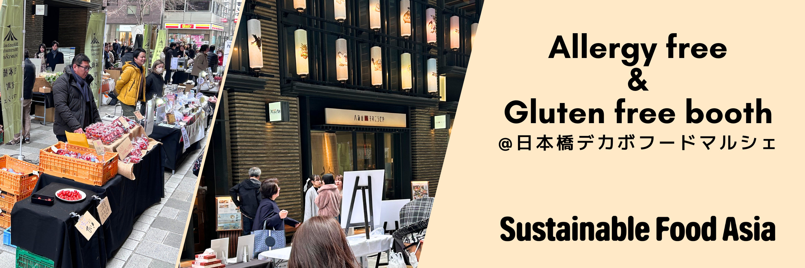 東南アジア企業と協力しサステナブルな⾷材の研究開発に取り組むSustainable Food Asia株式会社(以下「SFA」)は、生活者の声をもとに脱炭素関連商品・サービスや事業の開発を目指すEarth hacks株式会社(本社:東京都渋谷区、代表取締役社長:関根澄人、以下「Earth hacks」)がコレド室町仲通りにて共同で2024年3月8日(金)と9日(土)に開催する「デカボフードマルシェ」に、アレルギーフリー商品約25種を販売する「アレルギーフリー / グルテンフリーブース」を初出店します。