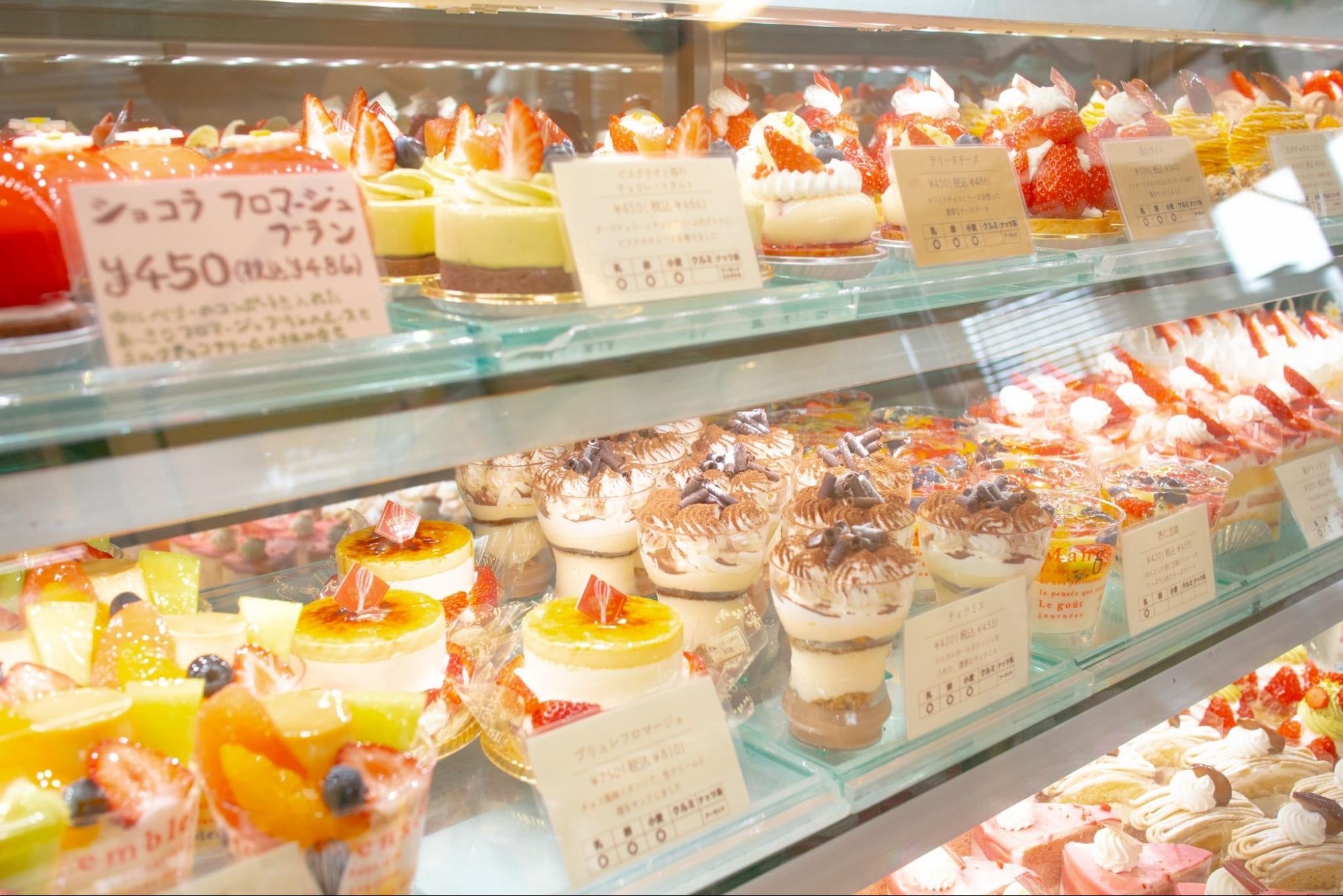 ショーケースには、季節のフルーツを使った華やかなケーキやタルトが並びます。