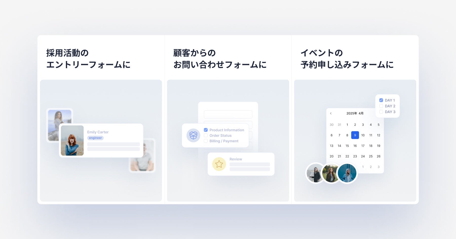 フォームは企業活動において、採用応募、問い合わせ、イベント申し込み、社内申請などさまざまなシーンで利用されます。「画像アップロードに対応したい」「回答数の上限を増やしたい」のように要件は細分化しやすく、結果として、複数のフォームサービスを使うケースも少なくありません。