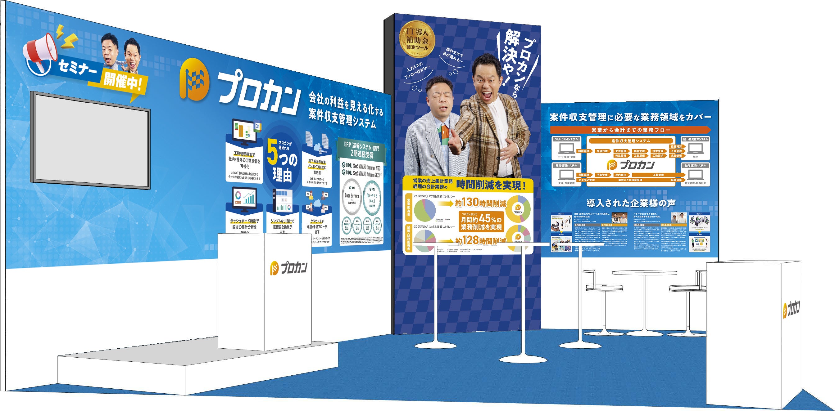 プロカンの強みである、「案件管理」「利益の見える化」「業務効率化」を具体的にイメージできるような展示内容です。ぜひお立ち寄りください。