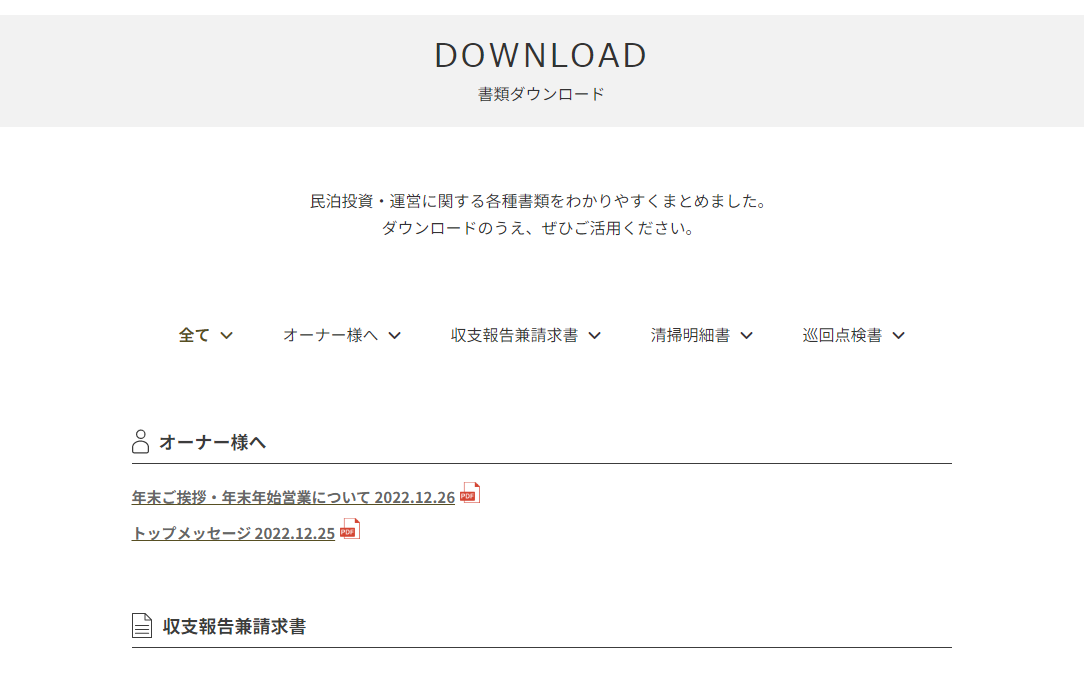 これらの書類は、民泊運営や物件の状況を知る上では欠かせない情報です。「W」では、書類を掲載する専用のページを設けて分かりやすい形で共有することにより、書類を探す、整理するといったオーナー様が従来行う作業のの負担を軽減することを目指しています。