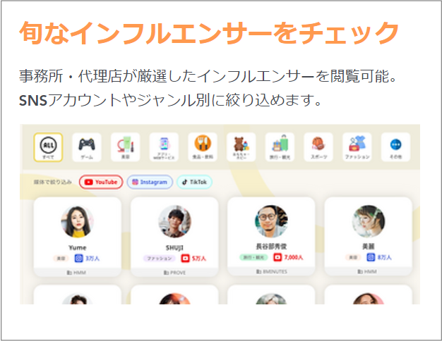 事務所・代理店が厳選したインフルエンサーを閲覧可能。SNSアカウントやジャンル別に絞り込めます。