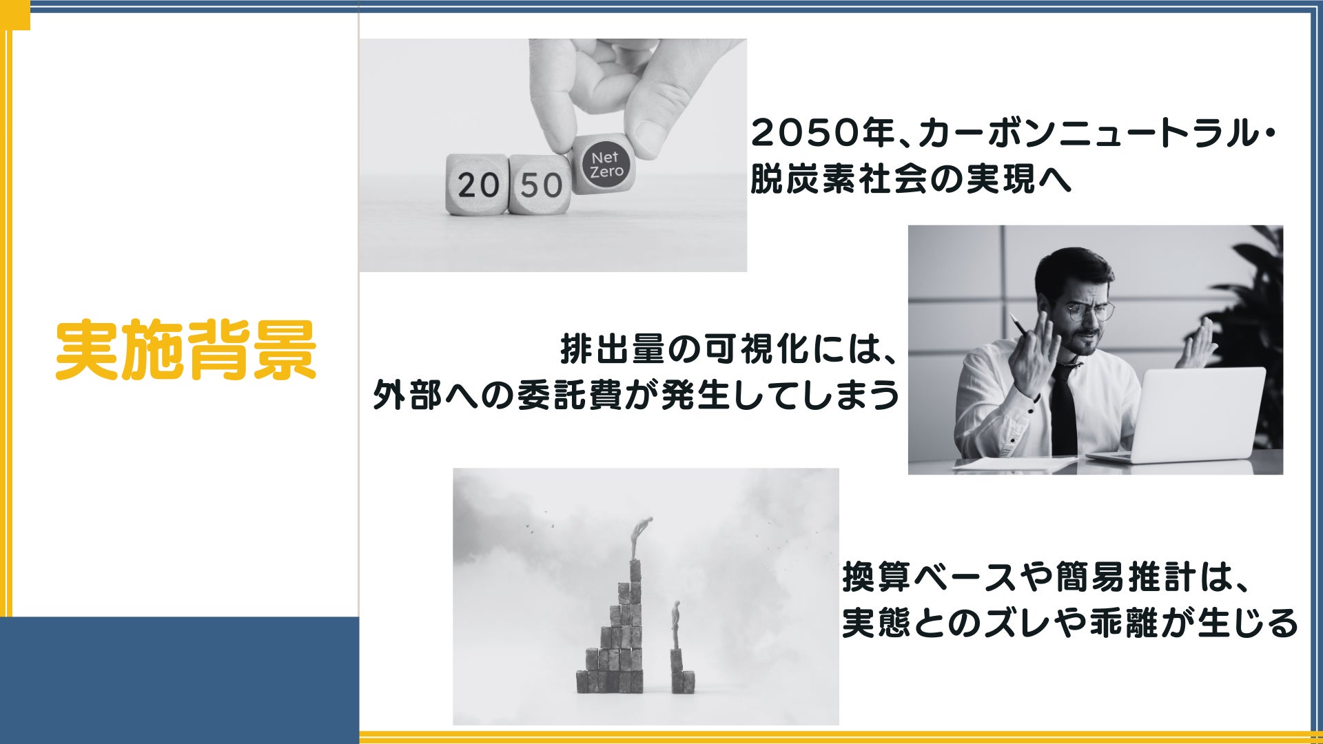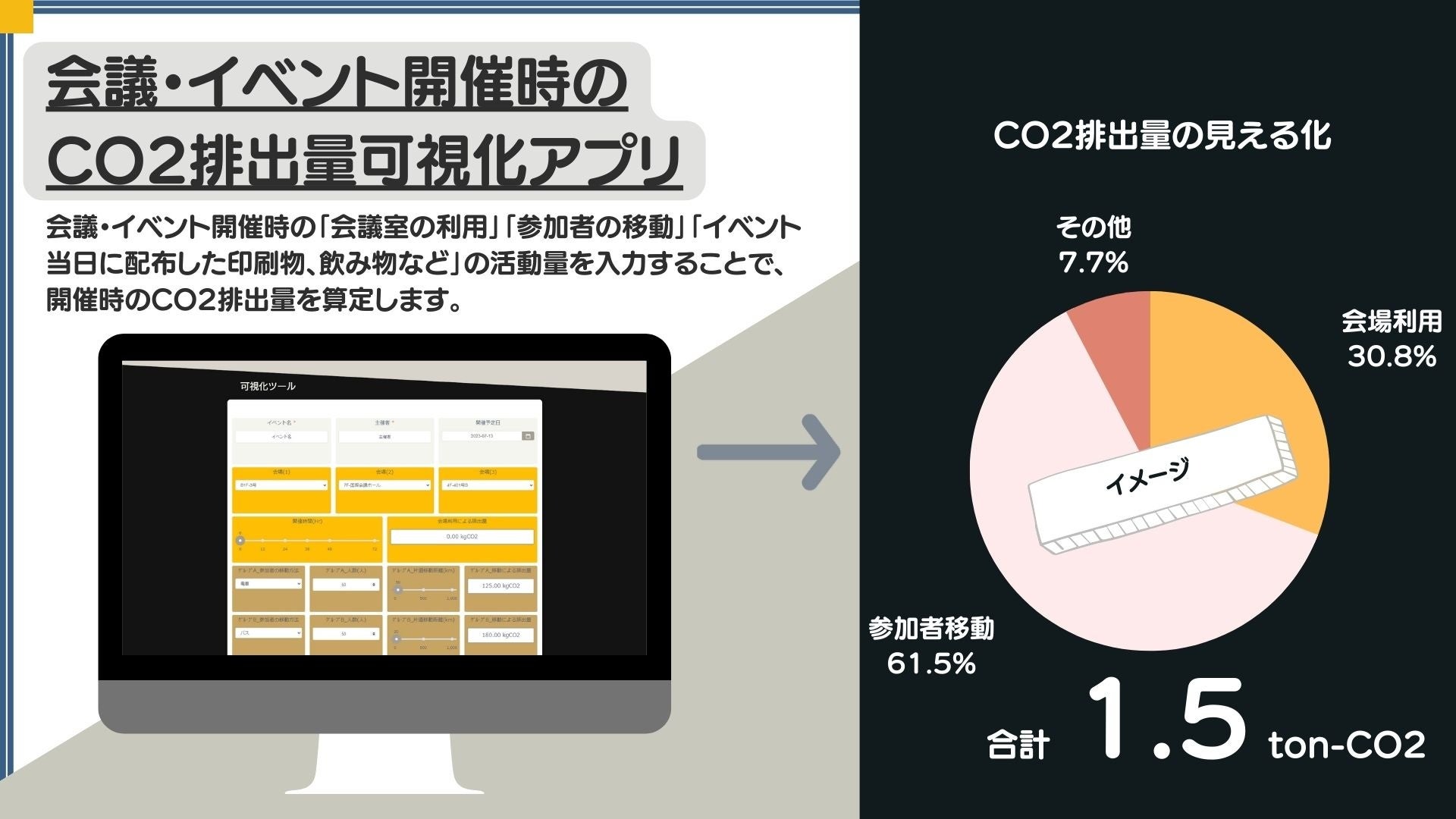 従来から、CO2算出やカーボンオフセットの手続きを自社で完結することが難しく外部へ委託する必要がありました。しかし、排出量を算出するたびに費用が発生するため、自治体や企業は可視化やカーボンオフセットに関心を持っていながらも、取り組むことが難しい現状があります。こうした現状を打開し、持続可能な社会や会議・イベントの低炭素化に向けた立案や施策の実行を加速させるため、簡単にCO2排出量を見える化するための環境を構築する必要があります。