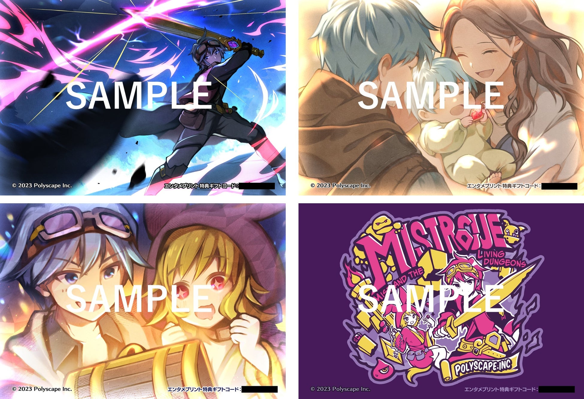 また正式リリースを記念して、コンビニのコピー機からブロマイドをプリントできる「エンタメプリント」のラインナップに「MISTROGUE ミストと生けるダンジョン」が登場。各ブロマイドに記載されたギフトコードを入力すると、ゲーム中でアイテム(消耗品)のセットが受け取れるアイテムガチャを実施します。