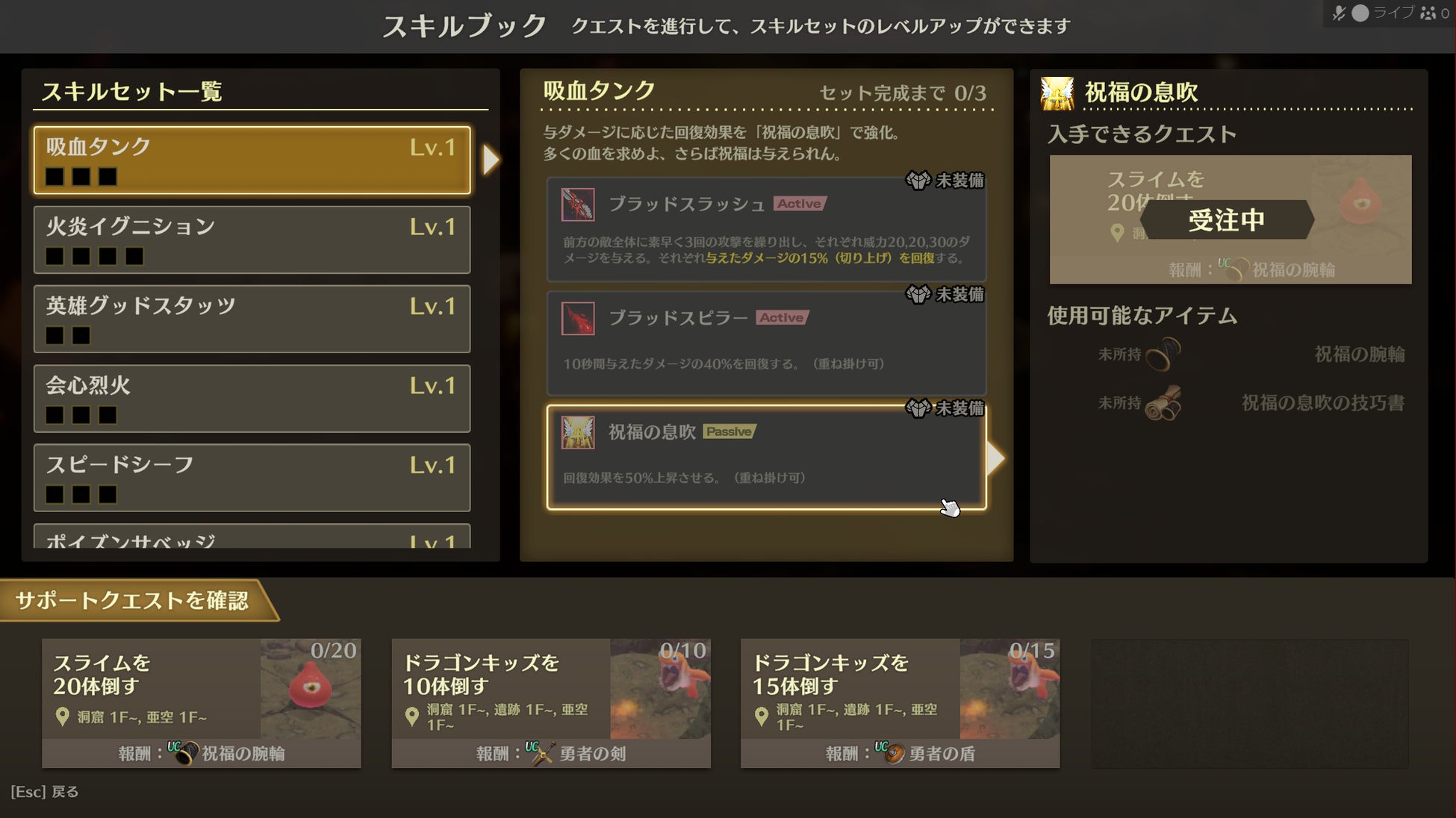 ルートガルの街のレックスから手渡される「スキルブック」には、予めおすすめのスキルセット(スキルビルド)が記されています。ビルドを完成させるためにはどのスキルが必要か、そのスキルはどの装備に付与されているか、という情報までが一目瞭然。未所持のスキル(装備)を手に入れる為に、「レッドドラゴンを15体倒す。報酬:烈火刀」といった討伐クエストも用意されています。