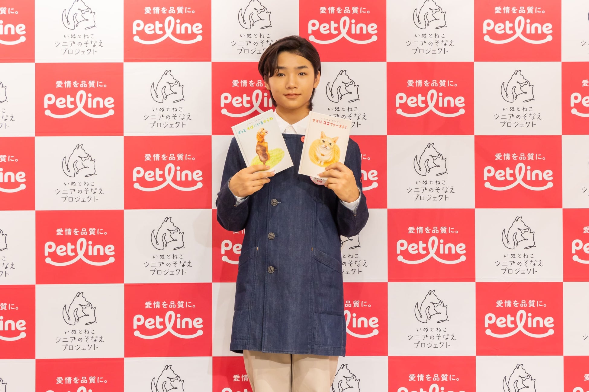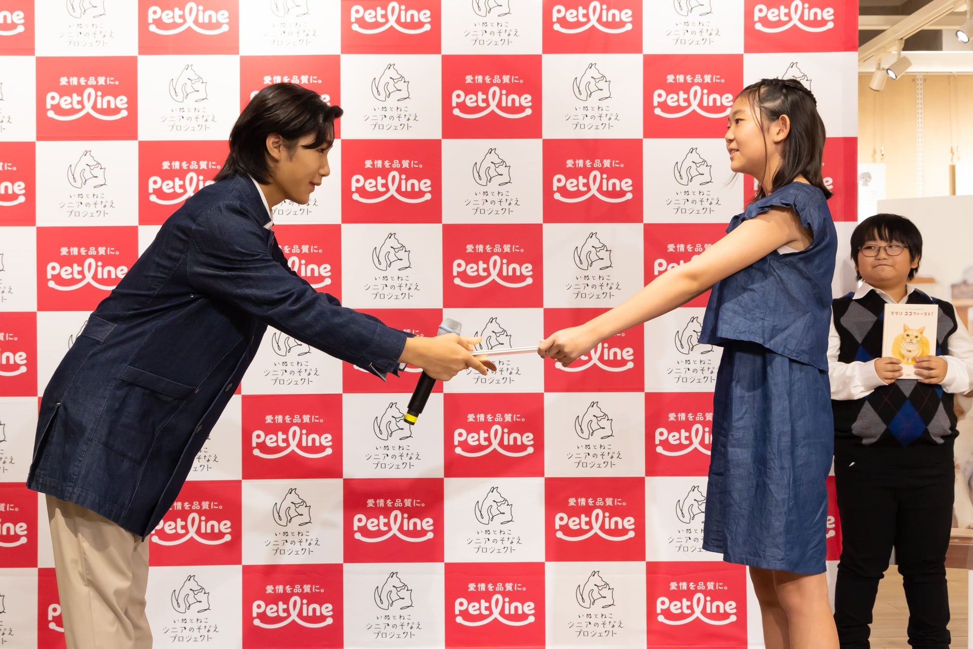 開催初日には「いぬとねこ シニアのそなえプロジェクト」プロジェクトアンバサダーの寺田心さんが来場し、ペットラインがオリジナルで制作した絵本「シニアのそなえものがたり」の贈呈式に出席。代表として会場に来場した児童2名に、小沼社長と絵本を手渡ししました。