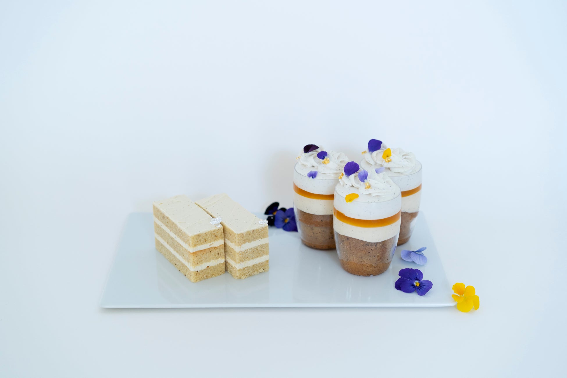 ブリオッシュ生地にラムベースのバニラシロップをたっぷりしみ込ませた<サヴァラン・ヴァニーユ>。エクアドル産タヒテンシス種バニラを贅沢に使用したバニラムースとバニラシャンティは、バニラの華やかな香りを引き立てる軽やかな味わいが特徴です。千葉県南房総市のこもおか農園産のパッションフルーツを使用したトロピカルなジュレがアクセントになっています。フランス展限定の生菓子なので、この機会をお見逃しなく!