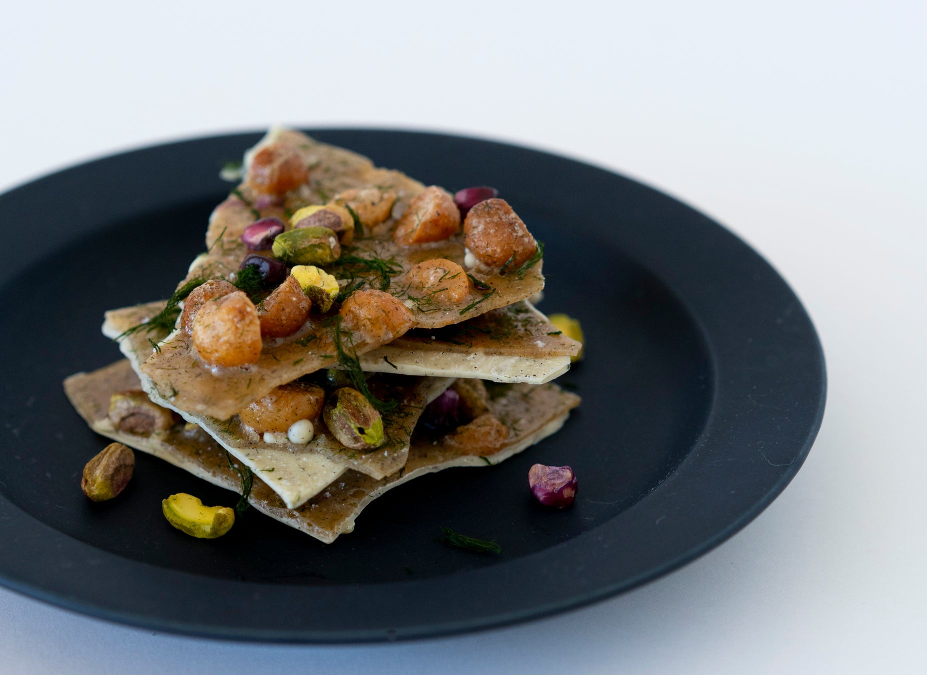 磯の香りに加え、ハーブに近い香りも持ち合わせている「シーベジタブル」のすじ青のりと、キャラメルの相性の良さを全面に押し出した、<キャラメル・ショコラ・マリン>。キャラメルとホワイトチョコにはインドネシア産タヒテンシス品種バニラをたっぷりと使用しました。オーガニックのマカダミアナッツやピスタチオ、徳島さんの大和ルージュという赤いとうもろこしなど、様々な食感もお楽しみいただけます。徳島産平釜塩を効かせ、最高の「甘じょっぱい」を表現しています。