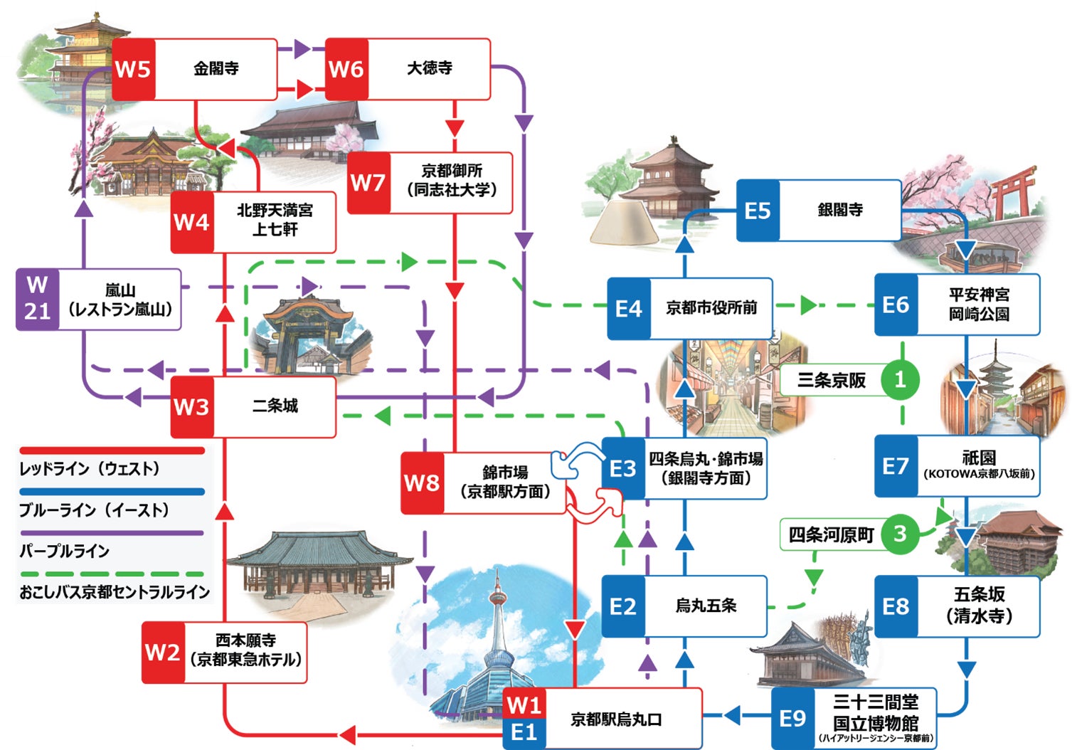 ●運行ルート(「おこしバス京都セントラルライン」にもスカイホップバスチケットでご乗車できます)