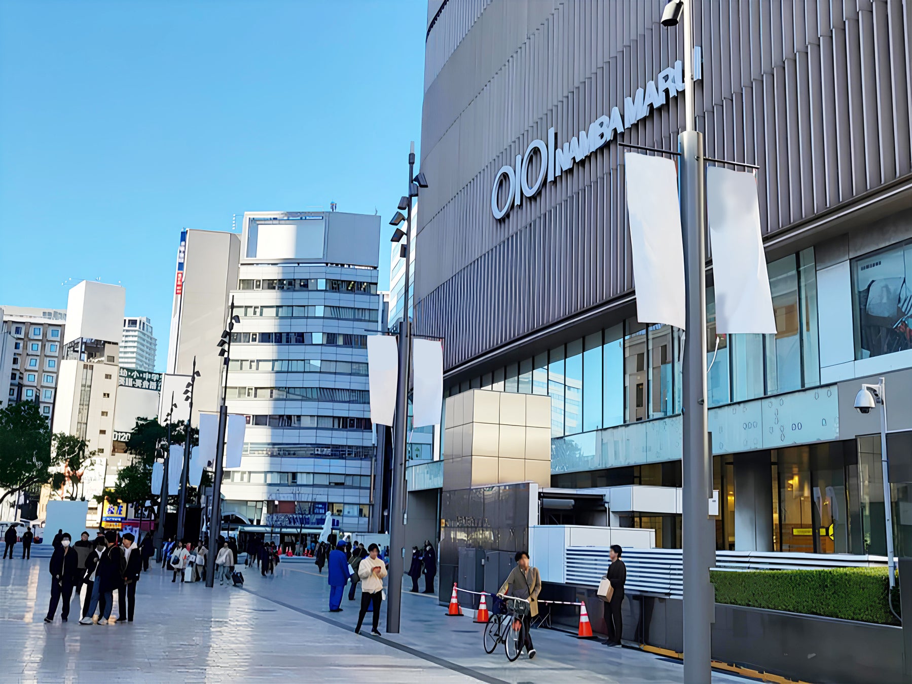 大阪・ミナミの玄関口に位置し、休日約21万人、平日約11万人が往来する大阪屈指の人流拠点「なんば広場」。この場所にて、広場内の照明柱全10基を活用したフラッグ広告を、2025年12月1日より申込受付を開始し、2026年3月より本格稼働いたします。