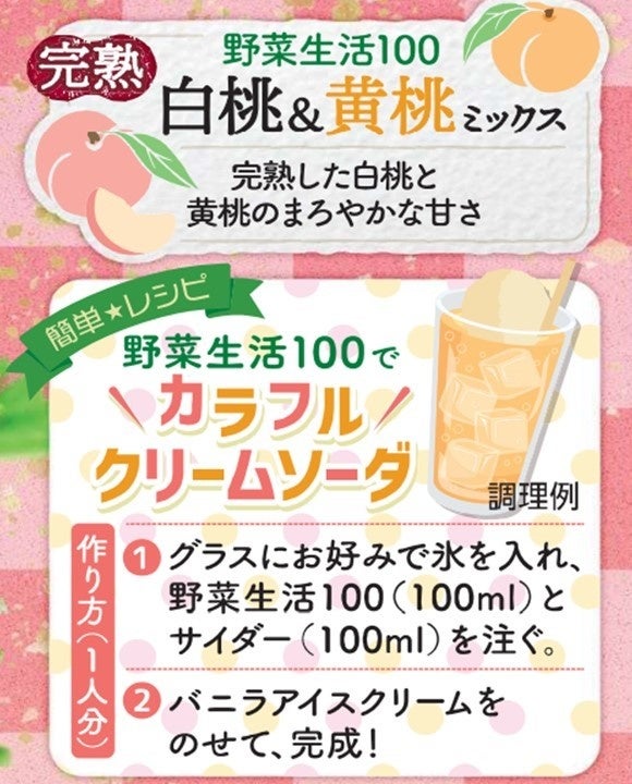 完熟した白桃と黄桃のまろやかな甘さを楽しめる、季節のおいしさをお届けする野菜&果実ミックスジュースです。本品を使用した簡単アレンジで、サイダーとバニラアイスクリームを使った「カラフルクリームソーダ」をおすすめしています。
