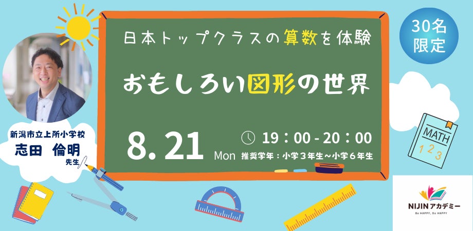 日本中の学校をハッピーにする株式会社NIJIN(本社:東京都江東区、代表取締役:星野達郎)は、小中学生向けオンラインスクール「NIJINアカデミー」を9月1日に開校いたします。日本トップレベルの現役教師による授業を自宅から受けられる環境をつくることで、学校が合わず、学びたくても学ぶ機会を失っている子どもに「学ぶ楽しさ」を提供します。開校に向け、体験授業を開催いたします。第1弾は、新潟市立上所小学校の志田倫明先生が算数の授業を行います。