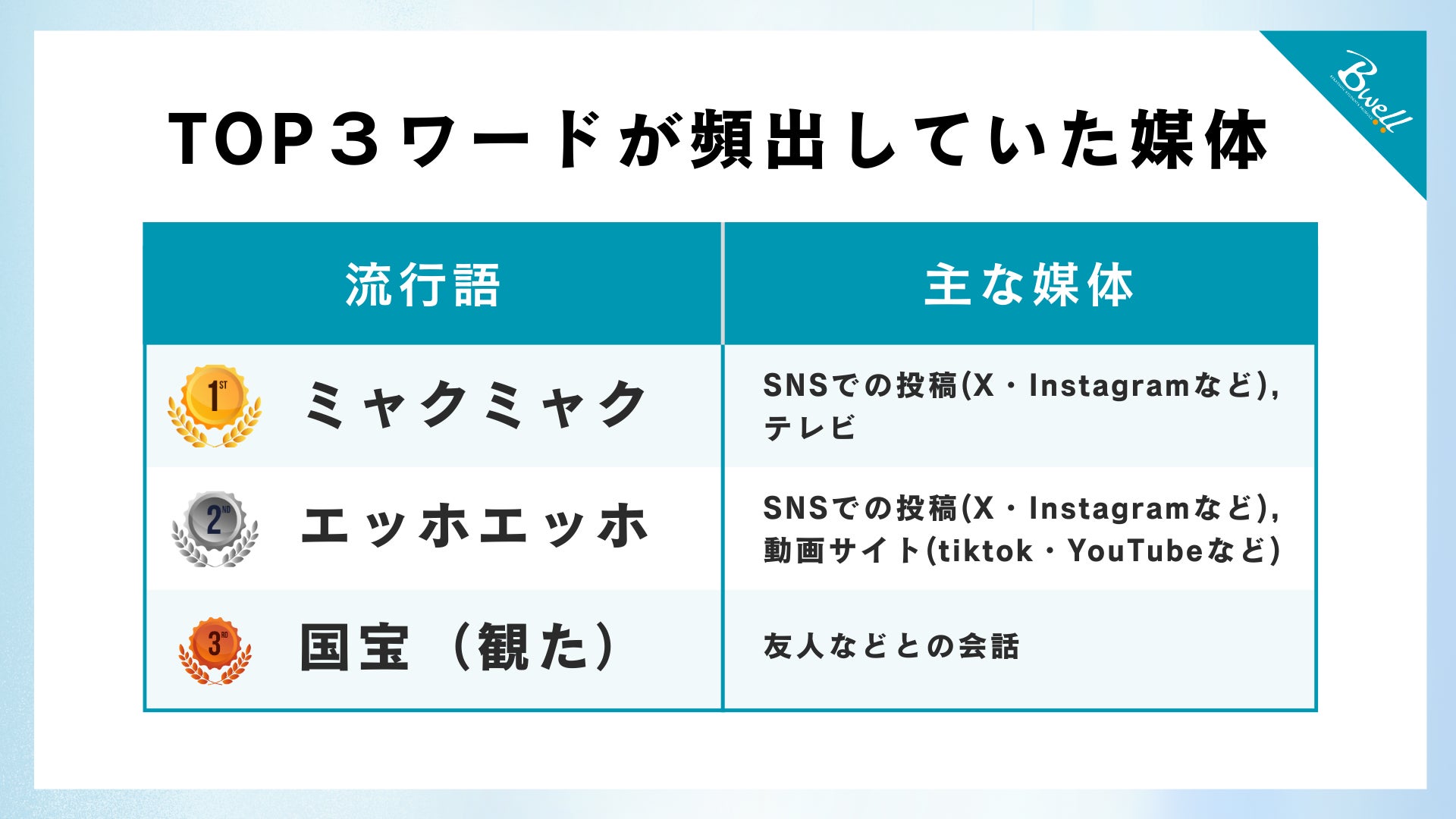 先述したTOP3のワードはどの場面や媒体でよく使われたのかを表したのが以下の通りです。