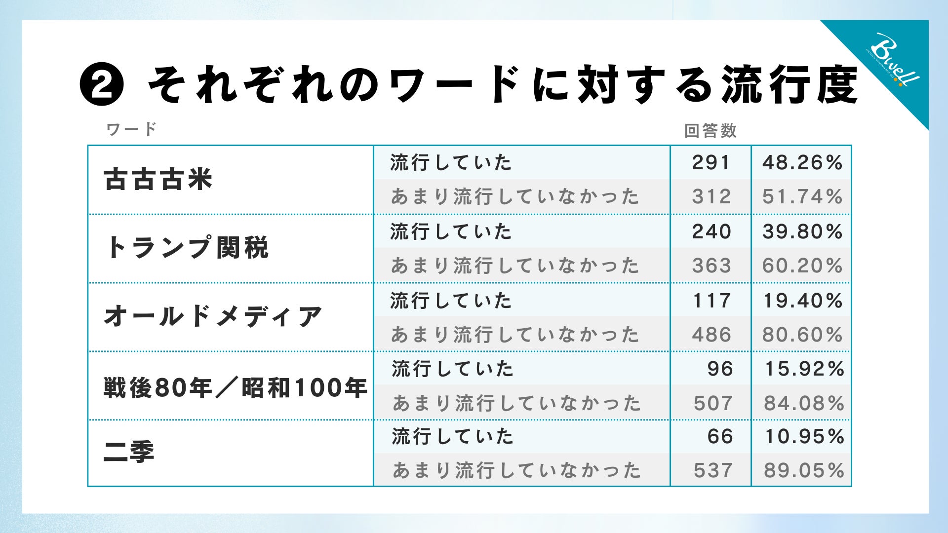 以下は2025年多数のメディアでも目にした流行語の流行度です。
