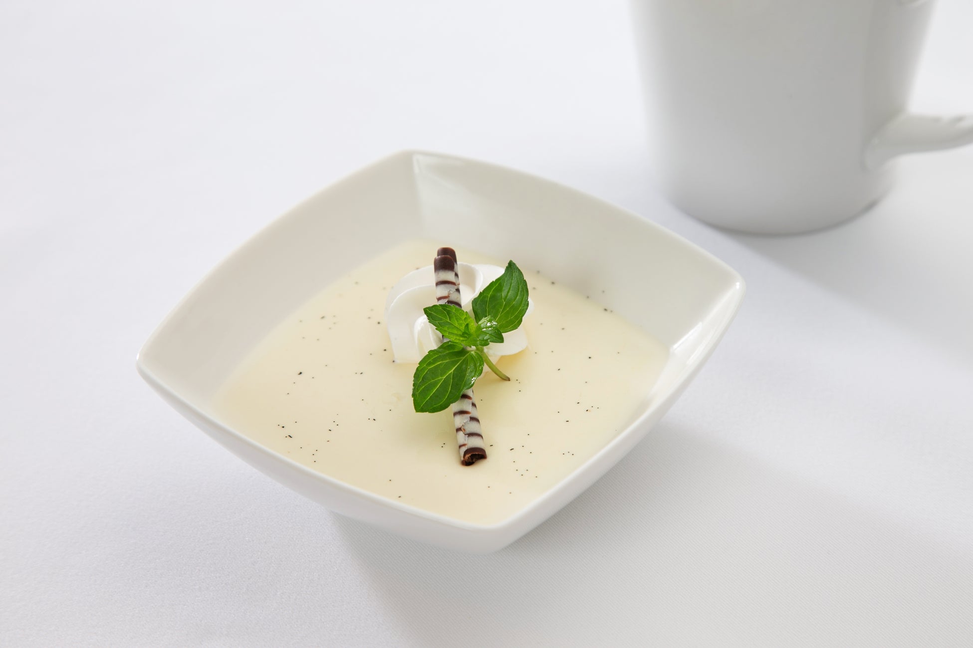 マーク関田シェフが監修する日本発のプレミアムキャビン(ビジネスクラス)の創作ハワイアンメニューでは、かぼちゃのスープ、国産黒豚の煮込み(味噌と蜂蜜のソース)、季節のお野菜とポテトピューレ、そしてデザートにはライエバニラのパンナコッタをご用意します。また、ご到着前のお食事も、マーク関田シェフのメニューをご用意しています。
